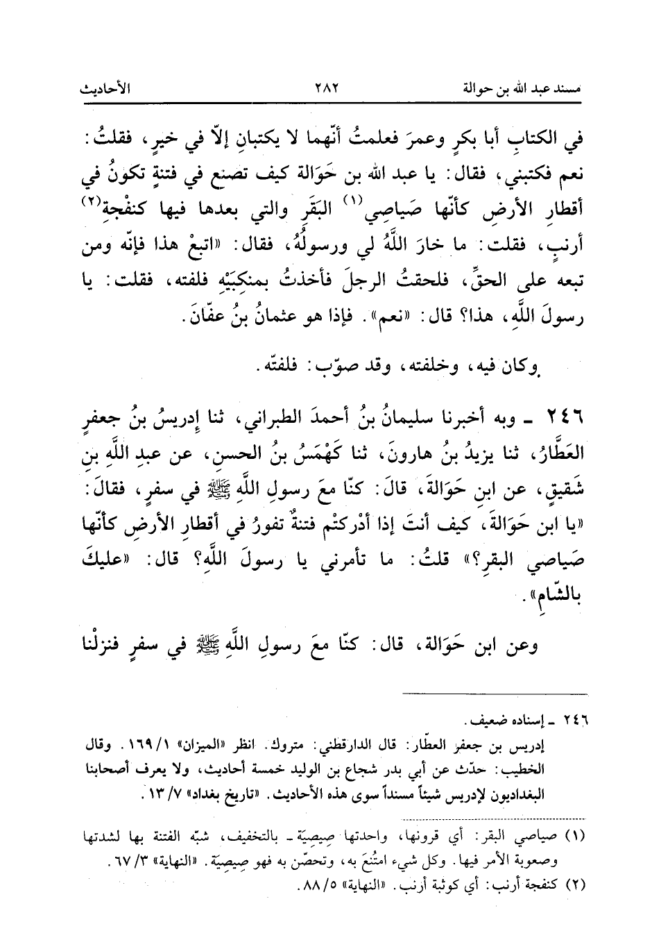 ٢٤٥ - وَبِهِ أَخْبَرَنَا سُلَيْمَانُ بْنُ أَحْمَدَ الطَّبَرَانِيُّ، ثَنَا إِدْرِيسُ بْنُ جَعْفَرٍ الْعَطَّارُ، ثَنَا يَزِيدُ بْنُ هَارُونَ، ثَنَا كَهْمَسُ بْنُ الْحَسَنِ، عَنْ عَبْدِ اللهِ بْنِ شَقِيقٍ، عَنِ ابْنِ حَوَالَةَ قَالَ: «كُنَّا مَعَ رَسُولِ اللهِ صَلَّى اللهُ عَلَيْهِ وَسَلَّمَ فِي سَفَرٍ فَقَالَ: يَا ابْنَ حَوَالَةَ، كَيْفَ أَنْتَ إِذَا أَدْرَكْتُمْ فِتْنَةً تَفُورُ فِي أَقْطَارِ الْأَرْضِ كَأَنَّهَا صَيَاصِي الْبَقَرِ؟ قُلْتُ: مَا تَأْمُرُنِي يَا رَسُولَ اللهِ؟ قَالَ: عَلَيْكَ بِالشَّامِ».