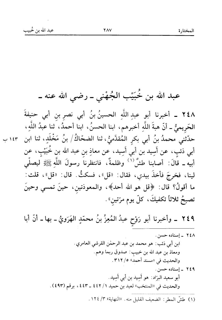 ٢٤٨ - أَخْبَرَنَا أَبُو عَبْدِ اللهِ الْحُسَيْنُ بْنُ أَبِي نَصْرِ بْنِ أَبِي حَنِيفَةَ الْحَرِيمِيُّ، أَنَّ هِبَةَ اللهِ أَخْبَرَهُمْ، أَبْنَا الْحَسَنُ، أَبْنَا أَحْمَدُ، ثَنَا عَبْدُ اللهِ، حَدَّثَنِي مُحَمَّدُ بْنُ أَبِي بَكْرٍ الْمُقَدَّمِيُّ، ثَنَا الضَّحَّاكُ بْنُ مَخْلَدٍ، ثَنَا ابْنُ أَبِي ذِئْبٍ، عَنْ أَسِيدِ بْنِ أَبِي أَسِيدٍ، عَنْ مُعَاذِ بْنِ عَبْدِ اللهِ بْنِ خُبَيْبٍ، عَنْ أَبِيهِ قَالَ: «أَصَابَنَا طَشٌّ وَظُلْمَةٌ، فَانْتَظَرْنَا رَسُولَ اللهِ صَلَّى اللهُ عَلَيْهِ وَسَلَّمَ لِيُصَلِّيَ لَنَا، فَخَرَجَ فَأَخَذَ بِيَدِي فَقَالَ: قُلْ، فَسَكَتُّ، قَالَ: قُلْ، قُلْتُ: مَا أَقُولُ؟ قَالَ: {قُلْ هُوَ اللهُ أَحَدٌ} وَالْمُعَوِّذَتَيْنِ، حِينَ تُمْسِي وَحِينَ تُصْبِحُ ثَلَاثًا تَكْفِيكَ، كُلَّ يَوْمٍ مَرَّتَيْنِ».