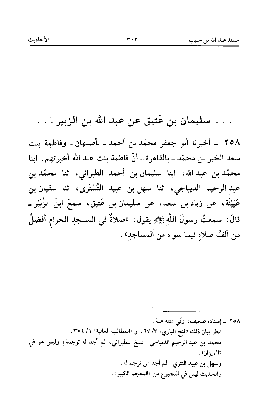 ٢٥٨ - أَخْبَرَنَا أَبُو جَعْفَرٍ مُحَمَّدُ بْنُ أَحْمَدَ - بِأَصْبَهَانَ - وَفَاطِمَةُ بِنْتُ سَعْدِ الْخَيْرِ بْنِ مُحَمَّدٍ - بِالْقَاهِرَةِ - أَنَّ فَاطِمَةَ بِنْتَ عَبْدِ اللهِ أَخْبَرَتْهُمْ، أَبْنَا مُحَمَّدُ بْنُ عَبْدِ اللهِ، أَبْنَا سُلَيْمَانُ بْنُ أَحْمَدَ الطَّبَرَانِيُّ، ثَنَا مُحَمَّدُ بْنُ عَبْدِ الرَّحِيمِ الدِّيبَاجِيُّ، ثَنَا سَهْلُ بْنُ عُبَيْدٍ التُّسْتَرِيُّ، ثَنَا سُفْيَانُ بْنُ عُيَيْنَةَ، عَنْ زِيَادِ بْنِ سَعْدٍ، عَنْ سُلَيْمَانَ بْنِ عَتِيقٍ، سَمِعَ ابْنَ الزُّبَيْرِ قَالَ: سَمِعْتُ رَسُولَ اللهِ صَلَّى اللهُ عَلَيْهِ وَسَلَّمَ يَقُولُ: «صَلَاةٌ فِي الْمَسْجِدِ الْحَرَامِ أَفْضَلُ مِنْ أَلْفِ صَلَاةٍ فِيمَا سِوَاهُ مِنَ الْمَسَاجِدِ».