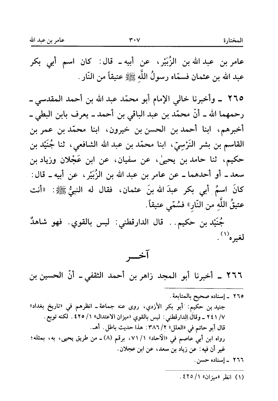 ٢٦٥ - وَأَخْبَرَنَا خَالِي الْإِمَامُ أَبُو مُحَمَّدٍ عَبْدُ اللهِ بْنُ أَحْمَدَ الْمَقْدِسِيُّ - رَحِمَهُمَا اللهُ - أَنَّ مُحَمَّدَ بْنَ عَبْدِ الْبَاقِي بْنِ أَحْمَدَ - يُعْرَفُ بِابْنِ الْبَطِّيِّ - أَخْبَرَهُمْ، أَبْنَا أَحْمَدُ بْنُ الْحَسَنِ بْنِ خَيْرُونَ، أَبْنَا مُحَمَّدُ بْنُ عُمَرَ بْنِ الْقَاسِمِ بْنِ بِشْرٍ النَّرْسِيُّ، أَبْنَا مُحَمَّدُ بْنُ عَبْدِ اللهِ الشَّافِعِيُّ، ثَنَا جُنَيْدُ بْنُ حَكِيمٍ، ثَنَا حَامِدُ بْنُ يَحْيَى، عَنْ سُفْيَانَ، عَنِ ابْنِ عَجْلَانَ وَزِيَادِ بْنِ سَعْدٍ - أَوْ أَحَدِهِمَا - عَنْ عَامِرِ بْنِ عَبْدِ اللهِ بْنِ الزُّبَيْرِ، عَنْ أَبِيهِ قَالَ: «كَانَ اسْمُ أَبِي بَكْرٍ عَبْدَ اللهِ بْنَ عُثْمَانَ، فَقَالَ لَهُ النَّبِيُّ صَلَّى اللهُ عَلَيْهِ وَسَلَّمَ: أَنْتَ عَتِيقُ اللهِ مِنَ النَّارِ، فَسُمِّيَ عَتِيقًا».