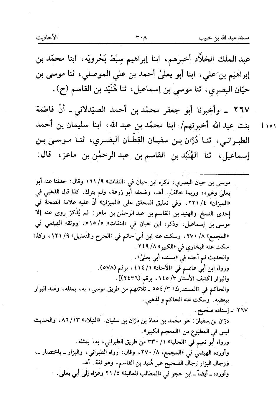 ٢٦٧ - وَأَخْبَرَنَا أَبُو جَعْفَرٍ مُحَمَّدُ بْنُ أَحْمَدَ الصَّيْدَلَانِيُّ، أَنَّ فَاطِمَةَ بِنْتَ عَبْدِ اللهِ أَخْبَرَتْهُمْ، أَبْنَا مُحَمَّدُ بْنُ عَبْدِ اللهِ، أَبْنَا سُلَيْمَانُ بْنُ أَحْمَدَ الطَّبَرَانِيُّ، ثَنَا دُرَّانُ بْنُ سُفْيَانَ الْقَطَّانُ الْبَصْرِيُّ، ثَنَا مُوسَى بْنُ إِسْمَاعِيلَ، ثَنَا الْهُنَيْدُ بْنُ الْقَاسِمِ بْنِ عَبْدِ الرَّحْمَنِ بْنِ مَاعِزٍ، قَالَ: