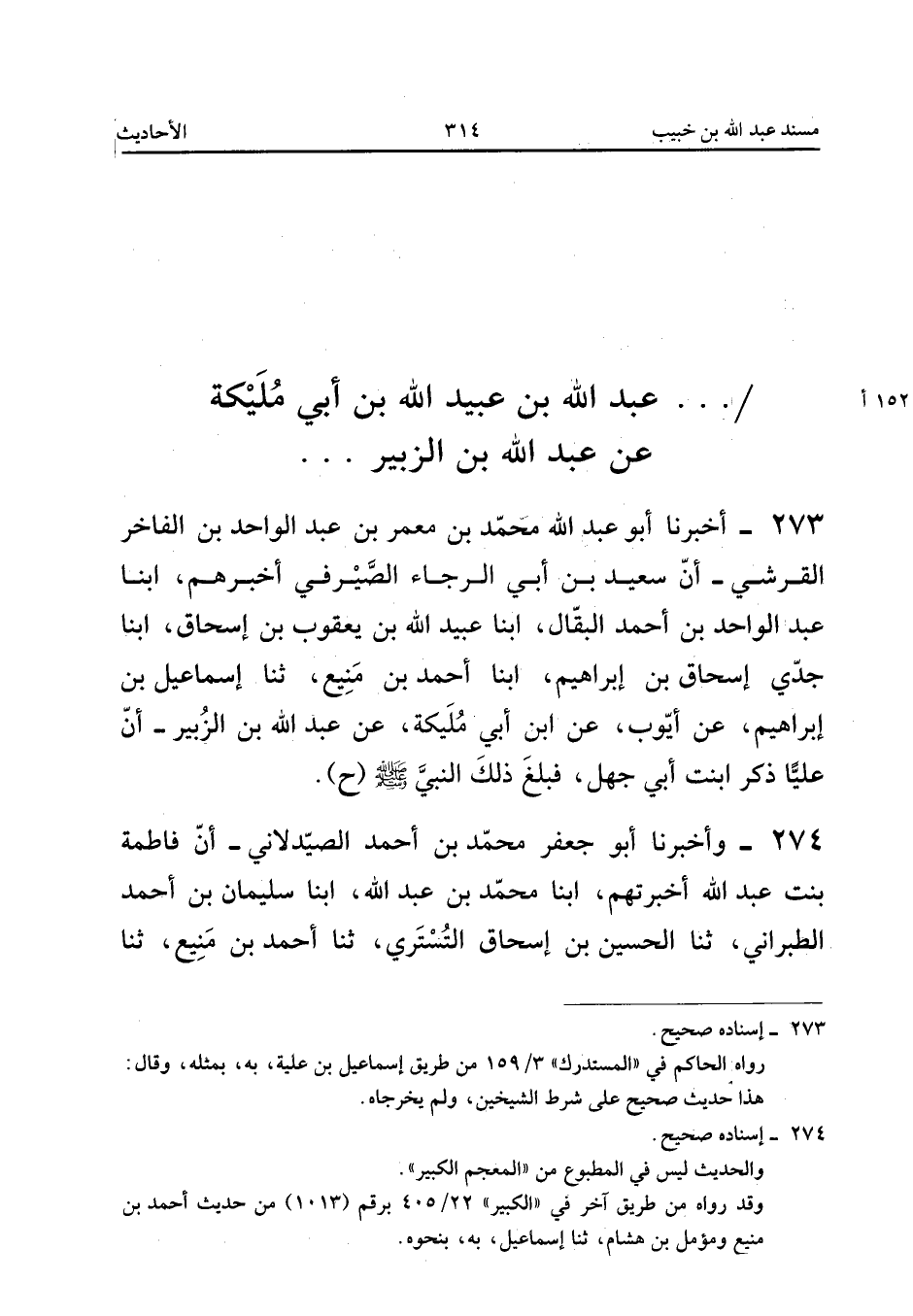 ٢٧٣ - أَخْبَرَنَا أَبُو عَبْدِ اللهِ مُحَمَّدُ بْنُ مَعْمَرِ بْنِ عَبْدِ الْوَاحِدِ بْنِ الْفَاخِرِ الْقُرَشِيُّ، أَنَّ سَعِيدَ بْنَ أَبِي الرَّجَاءِ الصَّيْرَفِيَّ أَخْبَرَهُمْ، أَبْنَا عَبْدُ الْوَاحِدِ بْنُ أَحْمَدَ الْبَقَّالُ، أَبْنَا عُبَيْدُ اللهِ بْنُ يَعْقُوبَ بْنِ إِسْحَاقَ، أَبْنَا جَدِّي إِسْحَاقُ بْنُ إِبْرَاهِيمَ، أَبْنَا أَحْمَدُ بْنُ مَنِيعٍ، ثَنَا إِسْمَاعِيلُ بْنُ إِبْرَاهِيمَ، عَنْ أَيُّوبَ، عَنِ ابْنِ أَبِي مُلَيْكَةَ، عَنْ عَبْدِ اللهِ بْنِ الزُّبَيْرِ: «أَنَّ عَلِيًّا ذَكَرَ بِنْتَ أَبِي جَهْلٍ، فَبَلَغَ ذَلِكَ النَّبِيَّ صَلَّى اللهُ عَلَيْهِ وَسَلَّمَ» (ح).