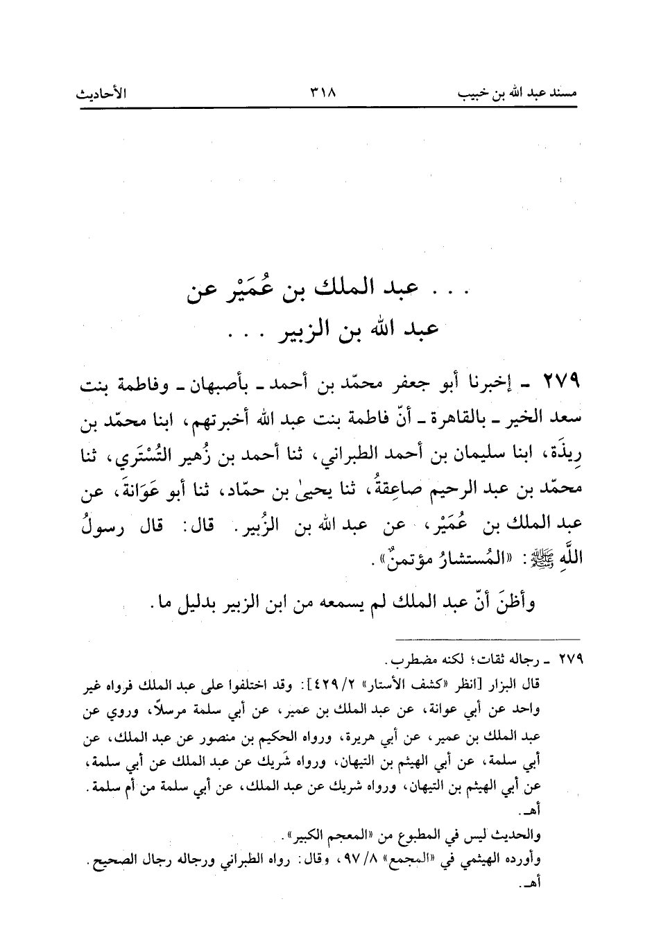 ٢٧٩ - أَخْبَرَنَا أَبُو جَعْفَرٍ مُحَمَّدُ بْنُ أَحْمَدَ - بِأَصْبَهَانَ - وَفَاطِمَةُ بِنْتُ سَعْدِ الْخَيْرِ - بِالْقَاهِرَةِ - أَنَّ فَاطِمَةَ بِنْتَ عَبْدِ اللهِ أَخْبَرَتْهُمْ، أَبْنَا مُحَمَّدُ بْنُ رِيذَةَ، أَبْنَا سُلَيْمَانُ بْنُ أَحْمَدَ الطَّبَرَانِيُّ، ثَنَا أَحْمَدُ بْنُ زُهَيْرٍ التُّسْتَرِيُّ، ثَنَا مُحَمَّدُ بْنُ عَبْدِ الرَّحِيمِ صَاعِقَةُ، ثَنَا يَحْيَى بْنُ حَمَّادٍ، ثَنَا أَبُو عَوَانَةَ، عَنْ عَبْدِ الْمَلِكِ بْنِ عُمَيْرٍ، عَنْ عَبْدِ اللهِ بْنِ الزُّبَيْرِ قَالَ: قَالَ رَسُولُ اللهِ صَلَّى اللهُ عَلَيْهِ وَسَلَّمَ: «الْمُسْتَشَارُ مُؤْتَمَنٌ».