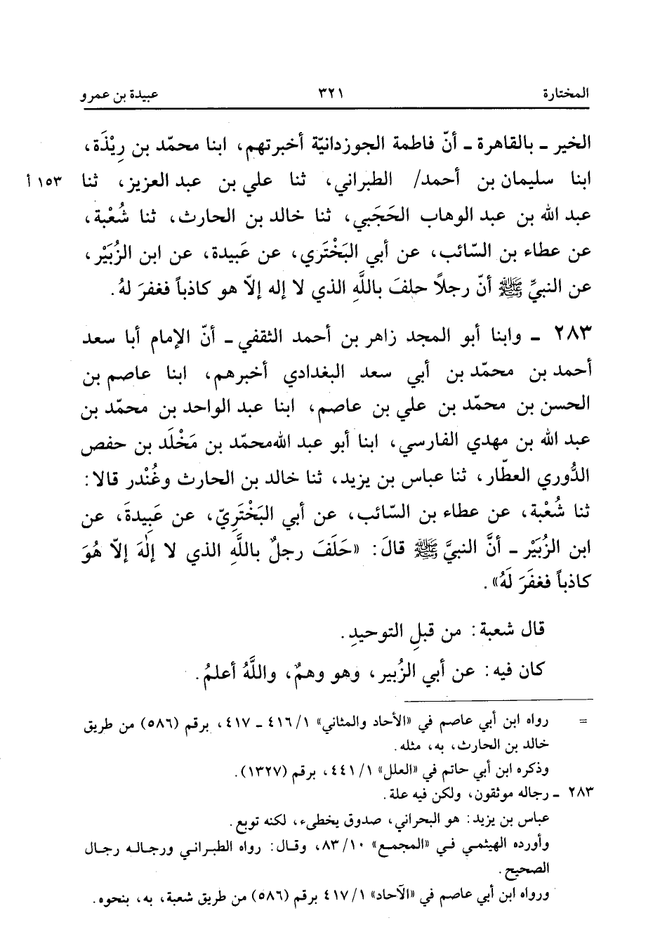 ٢٨٣ - وَابْنًا أَبُو الْمَجْدِ زَاهِرُ بْنُ أَحْمَدَ الثَّقَفِيُّ، أَنَّ الْإِمَامَ أَبَا سَعْدٍ أَحْمَدَ بْنَ مُحَمَّدِ بْنِ أَبِي سَعْدٍ الْبَغْدَادِيَّ أَخْبَرَهُمْ، أَبْنَا عَاصِمُ بْنُ الْحَسَنِ بْنِ مُحَمَّدِ بْنِ عَلِيِّ بْنِ عَاصِمٍ، أَبْنَا عَبْدُ الْوَاحِدِ بْنُ مُحَمَّدِ بْنِ عَبْدِ اللهِ بْنِ مَهْدِيٍّ الْفَارِسِيُّ، أَبْنَا أَبُو عَبْدِ اللهِ مُحَمَّدُ بْنُ مَخْلَدِ بْنِ حَفْصٍ الدُّورِيُّ الْعَطَّارُ، ثَنَا عَبَّاسُ بْنُ يَزِيدَ، ثَنَا خَالِدُ بْنُ الْحَارِثِ وَغُنْدَرٌ قَالَا: ثَنَا شُعْبَةُ، عَنْ عَطَاءِ بْنِ السَّائِبِ، عَنْ أَبِي الْبَخْتَرِيِّ، عَنْ عَبِيدَةَ، عَنِ ابْنِ الزُّبَيْرِ: أَنَّ النَّبِيَّ صَلَّى اللهُ عَلَيْهِ وَسَلَّمَ قَالَ: «حَلَفَ رَجُلٌ بِاللهِ الَّذِي لَا إِلَهَ إِلَّا هُوَ، كَاذِبًا، فَغُفِرَ لَهُ».