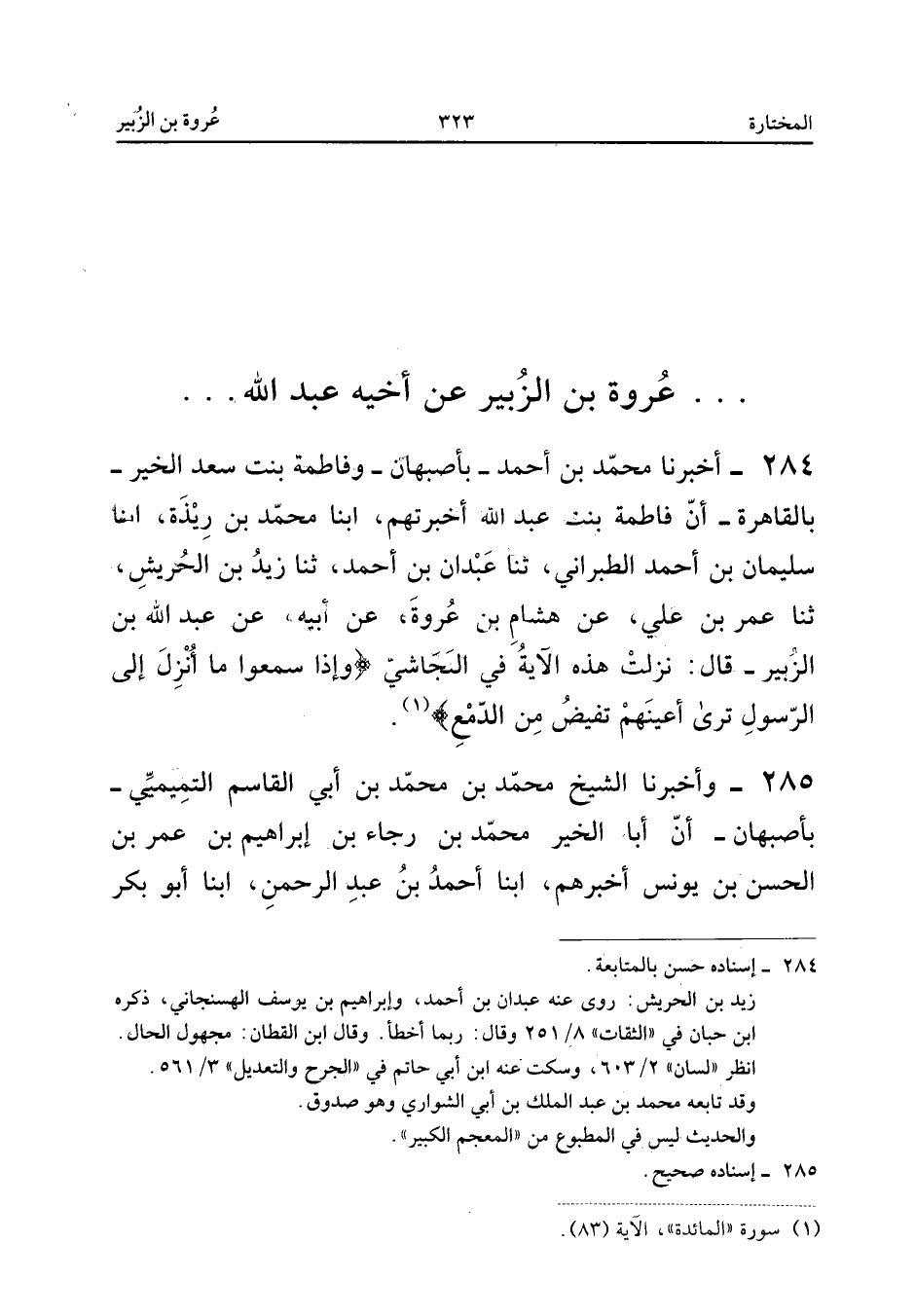 ٢٨٤ - أَخْبَرَنَا مُحَمَّدُ بْنُ أَحْمَدَ - بِأَصْبَهَانَ - وَفَاطِمَةُ بِنْتُ سَعْدِ الْخَيْرِ - بِالْقَاهِرَةِ - أَنَّ فَاطِمَةَ بِنْتَ عَبْدِ اللهِ أَخْبَرَتْهُمْ، أَبْنَا مُحَمَّدُ بْنُ رِيذَةَ، أَبْنَا سُلَيْمَانُ بْنُ أَحْمَدَ الطَّبَرَانِيُّ، ثَنَا عَبْدَانُ بْنُ أَحْمَدَ، ثَنَا زَيْدُ بْنُ الْحَرِيشِ، ثَنَا عُمَرُ بْنُ عَلِيٍّ، عَنْ هِشَامِ بْنِ عُرْوَةَ، عَنْ أَبِيهِ، عَنْ عَبْدِ اللهِ بْنِ الزُّبَيْرِ قَالَ: «نَزَلَتْ هَذِهِ الْآيَةُ فِي النَّجَاشِيِّ: {وَإِذَا سَمِعُوا مَا أُنْزِلَ إِلَى الرَّسُولِ تَرَى أَعْيُنَهُمْ تَفِيضُ مِنَ الدَّمْعِ}».