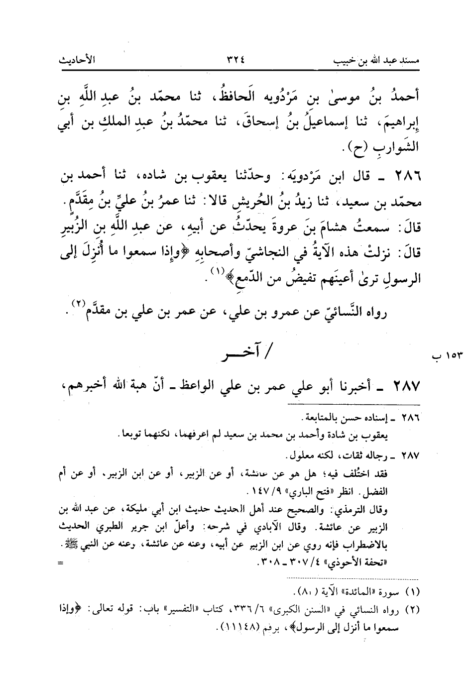 ٢٨٦ - قَالَ ابْنُ مَرْدُوَيْهِ: وَحَدَّثَنَا يَعْقُوبُ بْنُ شَادَهْ، ثَنَا أَحْمَدُ بْنُ مُحَمَّدِ بْنِ سَعِيدٍ، ثَنَا زَيْدُ بْنُ الْحَرِيشِ قَالَا: ثَنَا عُمَرُ بْنُ عَلِيِّ بْنِ مُقَدَّمٍ، قَالَ: سَمِعْتُ هِشَامَ بْنَ عُرْوَةَ يُحَدِّثُ، عَنْ أَبِيهِ، عَنْ عَبْدِ اللهِ بْنِ الزُّبَيْرِ قَالَ: «نَزَلَتْ هَذِهِ الْآيَةُ فِي النَّجَاشِيِّ وَأَصْحَابِهِ: {وَإِذَا سَمِعُوا مَا أُنْزِلَ إِلَى الرَّسُولِ تَرَى أَعْيُنَهُمْ تَفِيضُ مِنَ الدَّمْعِ}».