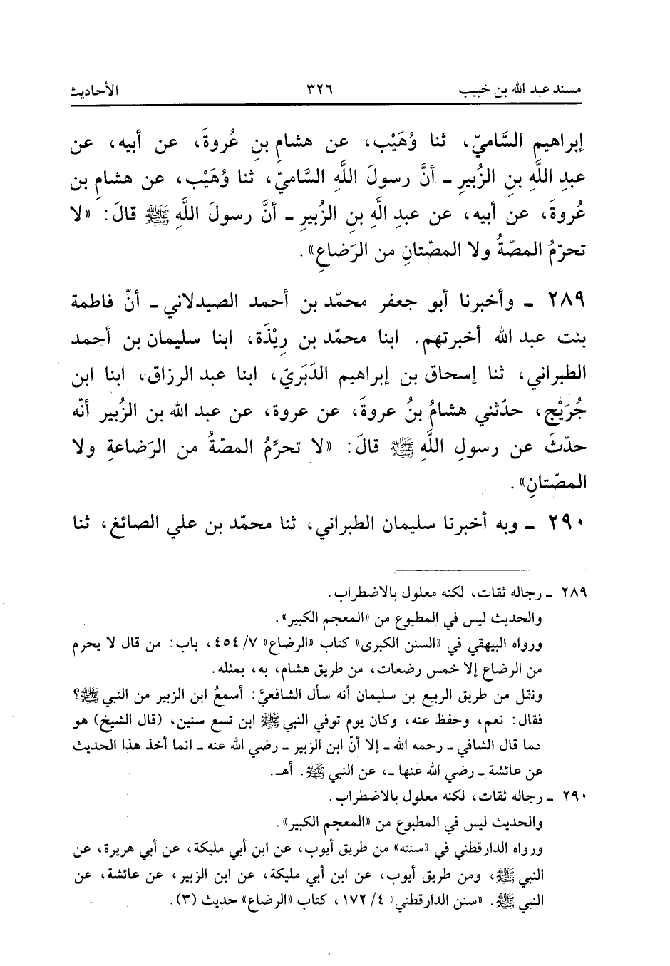 ٢٨٩ - وَأَخْبَرَنَا أَبُو جَعْفَرٍ مُحَمَّدُ بْنُ أَحْمَدَ الصَّيْدَلَانِيُّ، أَنَّ فَاطِمَةَ بِنْتَ عَبْدِ اللهِ أَخْبَرَتْهُمْ، أَبْنَا مُحَمَّدُ بْنُ رِيذَةَ، أَبْنَا سُلَيْمَانُ بْنُ أَحْمَدَ الطَّبَرَانِيُّ، ثَنَا إِسْحَاقُ بْنُ إِبْرَاهِيمَ الدَّبَرِيُّ، أَبْنَا عَبْدُ الرَّزَّاقِ، أَبْنَا ابْنُ جُرَيْجٍ، حَدَّثَنِي هِشَامُ بْنُ عُرْوَةَ، عَنْ عُرْوَةَ، عَنْ عَبْدِ اللهِ بْنِ الزُّبَيْرِ، أَنَّهُ حَدَّثَ عَنْ رَسُولِ اللهِ صَلَّى اللهُ عَلَيْهِ وَسَلَّمَ قَالَ: «لَا تُحَرِّمُ الْمَصَّةُ مِنَ الرَّضَاعَةِ وَلَا الْمَصَّتَانِ».