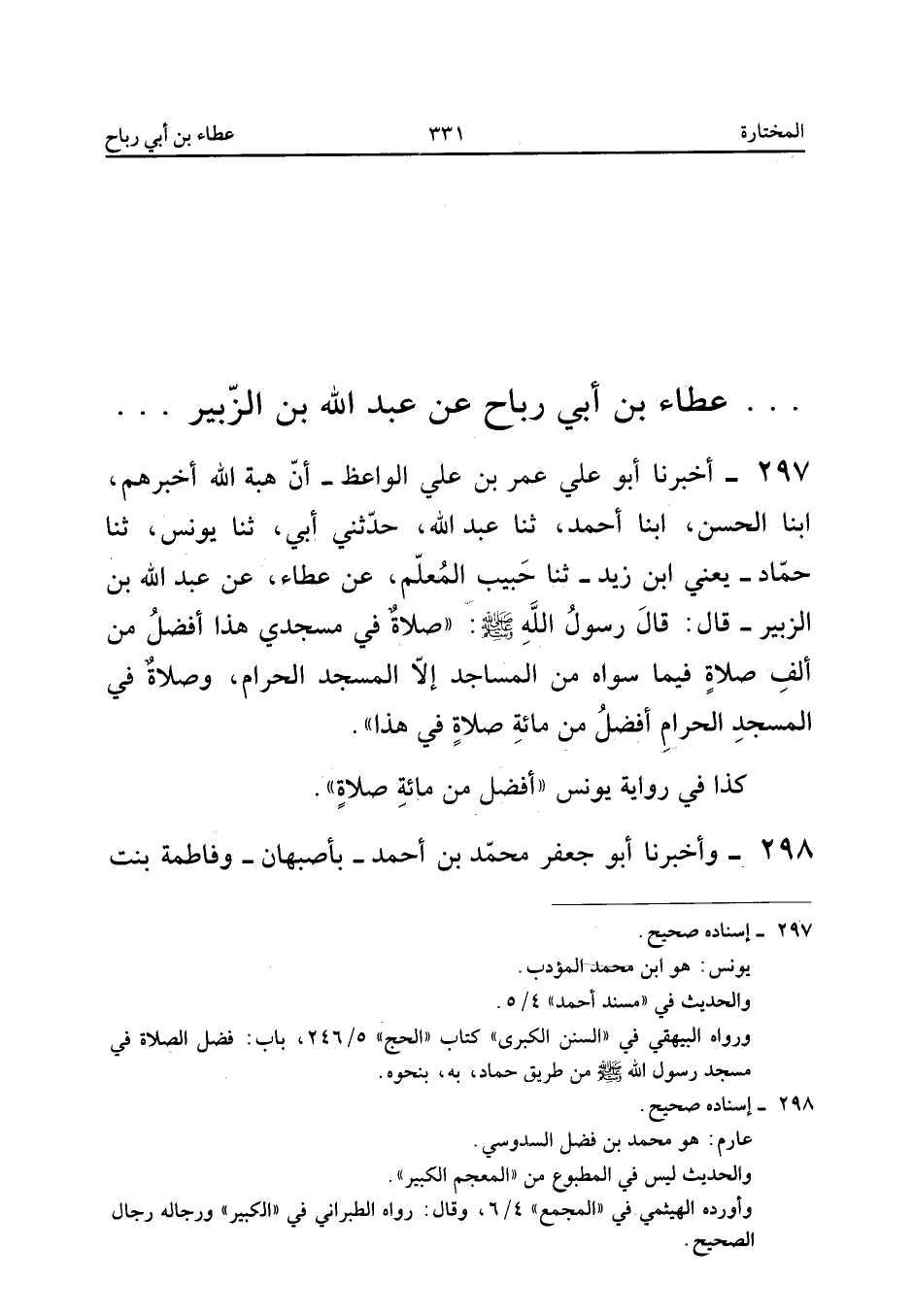 ٢٩٧ - أَخْبَرَنَا أَبُو عَلِيٍّ عُمَرُ بْنُ عَلِيٍّ الْوَاعِظُ، أَنَّ هِبَةَ اللهِ أَخْبَرَهُمْ، أَبْنَا الْحَسَنُ، أَبْنَا أَحْمَدُ، ثَنَا عَبْدُ اللهِ، حَدَّثَنِي أَبِي، ثَنَا يُونُسُ، ثَنَا حَمَّادٌ - يَعْنِي ابْنَ زَيْدٍ - ثَنَا حَبِيبٌ الْمُعَلِّمُ، عَنْ عَطَاءٍ، عَنْ عَبْدِ اللهِ بْنِ الزُّبَيْرِ قَالَ: قَالَ رَسُولُ اللهِ صَلَّى اللهُ عَلَيْهِ وَسَلَّمَ: «صَلَاةٌ فِي مَسْجِدِي هَذَا أَفْضَلُ مِنْ أَلْفِ صَلَاةٍ فِيمَا سِوَاهُ مِنَ الْمَسَاجِدِ إِلَّا الْمَسْجِدَ الْحَرَامَ، وَصَلَاةٌ فِي الْمَسْجِدِ الْحَرَامِ أَفْضَلُ مِنْ مِائَةِ صَلَاةٍ فِي هَذَا».