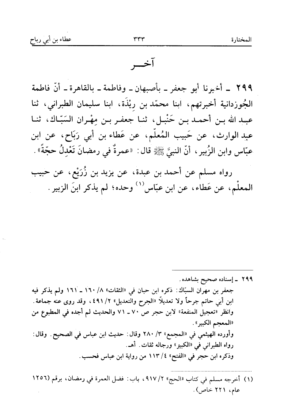 ٢٩٩ - أَخْبَرَنَا أَبُو جَعْفَرٍ - بِأَصْبَهَانَ - وَفَاطِمَةُ - بِالْقَاهِرَةِ - أَنَّ فَاطِمَةَ الْجُوزْدَانِيَّةَ أَخْبَرَتْهُمْ، أَبْنَا مُحَمَّدُ بْنُ رِيذَةَ، أَبْنَا سُلَيْمَانُ الطَّبَرَانِيُّ، ثَنَا عَبْدُ اللهِ بْنُ أَحْمَدَ بْنِ حَنْبَلٍ، ثَنَا جَعْفَرُ بْنُ مِهْرَانَ السَّبَّاكُ، ثَنَا عَبْدُ الْوَارِثِ، عَنْ حَبِيبٍ الْمُعَلِّمِ، عَنْ عَطَاءِ بْنِ أَبِي رَبَاحٍ، عَنِ ابْنِ عَبَّاسٍ وَابْنِ الزُّبَيْرِ: أَنَّ النَّبِيَّ صَلَّى اللهُ عَلَيْهِ وَسَلَّمَ قَالَ: «عُمْرَةٌ فِي رَمَضَانَ تَعْدِلُ حَجَّةً».