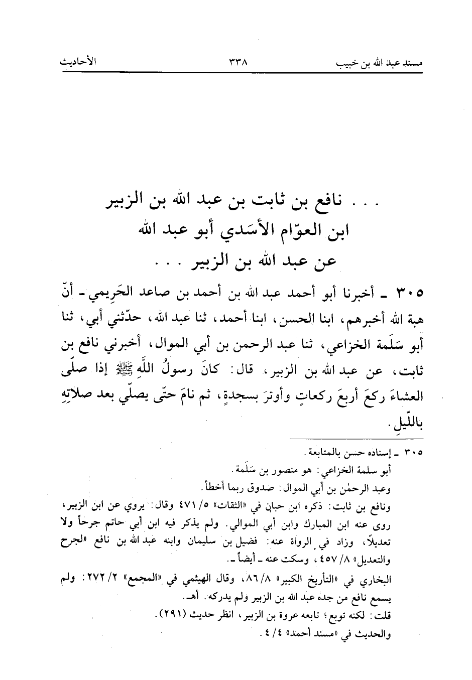 ٣٠٥ - أَخْبَرَنَا أَبُو أَحْمَدَ عَبْدُ اللهِ بْنُ أَحْمَدَ بْنِ صَاعِدٍ الْحَرِيمِيُّ (¬١)، أَنَّ هِبَةَ اللهِ أَخْبَرَهُمْ، أَبْنَا الْحَسَنُ، أَبْنَا أَحْمَدُ، ثَنَا عَبْدُ اللهِ، حَدَّثَنِي أَبِي، ثَنَا أَبُو سَلَمَةَ الْخُزَاعِيُّ، ثَنَا عَبْدُ الرَّحْمَنِ بْنُ أَبِي الْمَوَالِ، أَخْبَرَنِي نَافِعُ بْنُ ثَابِتٍ، عَنْ عَبْدِ اللهِ بْنِ الزُّبَيْرِ قَالَ: «كَانَ رَسُولُ اللهِ صَلَّى اللهُ عَلَيْهِ وَسَلَّمَ إِذَا صَلَّى الْعِشَاءَ رَكَعَ أَرْبَعَ رَكَعَاتٍ وَأَوْتَرَ بِسَجْدَةٍ، ثُمَّ نَامَ حَتَّى يُصَلِّيَ بَعْدُ صَلَاتَهُ بِاللَّيْلِ».