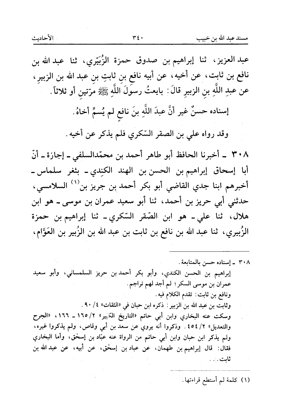٣٠٨ - أَخْبَرَنَا الْحَافِظُ أَبُو طَاهِرٍ أَحْمَدُ بْنُ مُحَمَّدٍ السِّلَفِيُّ - إِجَازَةً - أَنَّ أَبَا إِسْحَاقَ إِبْرَاهِيمَ بْنَ الْحَسَنِ بْنِ الْهِنْدِ الْكِنْدِيَّ - بِثَغْرِ سَلَمَاسَ - أَخْبَرَهُمْ، أَبْنَا جَدِّي الْقَاضِي أَبُو بَكْرٍ أَحْمَدُ بْنُ حَرِيزِ بْنِ ... السَّلَامِسِيُّ، حَدَّثَنِي أَبِي حَرِيزُ بْنُ أَحْمَدَ، ثَنَا أَبُو سَعِيدٍ عِمْرَانُ بْنُ مُوسَى - هُوَ ابْنُ هِلَالٍ - ثَنَا عَلِيٌّ - هُوَ ابْنُ الصَّقْرِ السُّكَّرِيُّ - ثَنَا إِبْرَاهِيمُ بْنُ حَمْزَةَ الزُّبَيْرِيُّ، ثَنَا عَبْدُ اللهِ بْنُ نَافِعِ بْنِ ثَابِتِ بْنِ عَبْدِ اللهِ بْنِ الزُّبَيْرِ بْنِ الْعَوَّامِ،