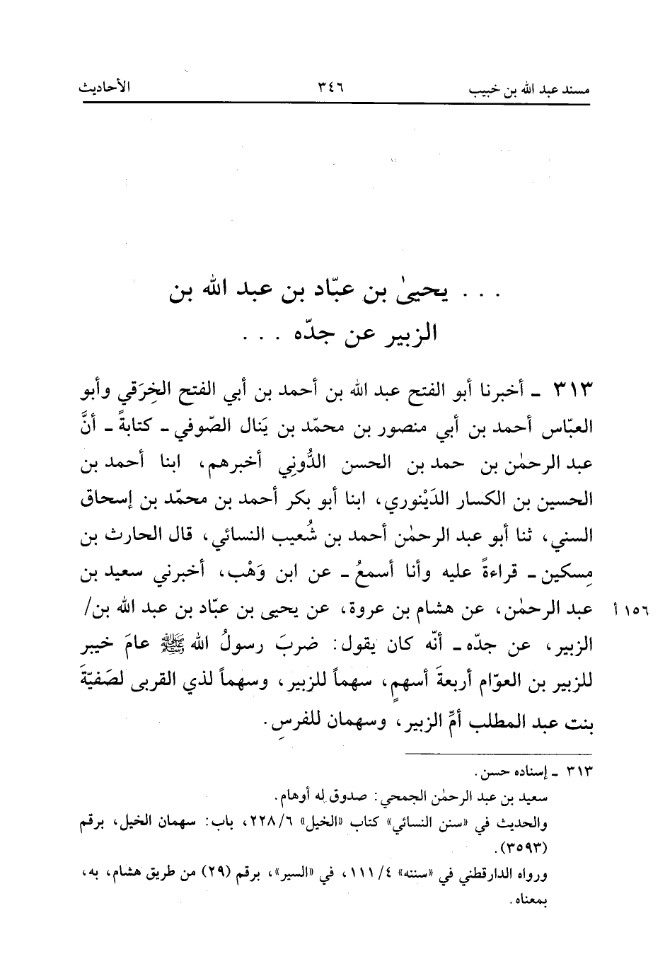 ٣١٣ - أَخْبَرَنَا أَبُو الْفَتْحِ عَبْدُ اللهِ بْنُ أَحْمَدَ بْنِ أَبِي الْفَتْحِ الْخَرَقِيُّ وَأَبُو الْعَبَّاسِ أَحْمَدُ بْنُ أَبِي مَنْصُورِ بْنِ مُحَمَّدِ بْنِ يَنَالَ الصُّوفِيُّ - كِتَابَةً - أَنَّ عَبْدَ الرَّحْمَنِ بْنَ حَمَدِ بْنِ الْحَسَنِ الدُّونِيَّ أَخْبَرَهُمْ، أَبْنَا أَحْمَدُ بْنُ الْحُسَيْنِ بْنِ الْكَسَّارِ الدِّينَوَرِيُّ، أَبْنَا أَبُو بَكْرٍ أَحْمَدُ بْنُ مُحَمَّدِ بْنِ إِسْحَاقَ السُّنِّيُّ، ثَنَا أَبُو عَبْدِ الرَّحْمَنِ أَحْمَدُ بْنُ شُعَيْبٍ النَّسَائِيُّ، قَالَ الْحَارِثُ بْنُ مِسْكِينٍ: قِرَاءَةً عَلَيْهِ وَأَنَا أَسْمَعُ، عَنِ ابْنِ وَهْبٍ، أَخْبَرَنِي سَعِيدُ بْنُ عَبْدِ الرَّحْمَنِ، عَنْ هِشَامِ بْنِ عُرْوَةَ، عَنْ يَحْيَى بْنِ عَبَّادِ بْنِ عَبْدِ اللهِ بْنِ الزُّبَيْرِ، عَنْ جَدِّهِ أَنَّهُ كَانَ يَقُولُ: «ضَرَبَ رَسُولُ اللهِ صَلَّى اللهُ عَلَيْهِ وَسَلَّمَ عَامَ خَيْبَرَ لِلزُّبَيْرِ بْنِ الْعَوَّامِ أَرْبَعَةَ أَسْهُمٍ، سَهْمًا لِلزُّبَيْرِ، وَسَهْمًا لِذِي الْقُرْبَى لِصَفِيَّةَ بِنْتِ عَبْدِ الْمُطَّلِبِ أُمِّ الزُّبَيْرِ، وَسَهْمَيْنِ لِلْفَرَسِ».