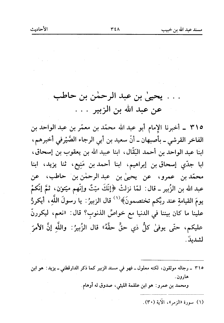 ٣١٥ - أَخْبَرَنَا الْإِمَامُ أَبُو عَبْدِ اللهِ مُحَمَّدُ بْنُ مَعْمَرِ بْنِ عَبْدِ الْوَاحِدِ بْنِ الْفَاخِرِ الْقُرَشِيُّ - بِأَصْبَهَانَ - أَنَّ سَعِيدَ بْنَ أَبِي الرَّجَاءِ الصَّيْرَفِيَّ أَخْبَرَهُمْ، أَبْنَا عَبْدُ الْوَاحِدِ بْنُ أَحْمَدَ الْبَقَّالُ، أَبْنَا عُبَيْدُ اللهِ بْنُ يَعْقُوبَ بْنِ إِسْحَاقَ، أَبْنَا جَدِّي إِسْحَاقُ بْنُ إِبْرَاهِيمَ، أَبْنَا أَحْمَدُ بْنُ مَنِيعٍ، ثَنَا يَزِيدُ، أَبْنَا مُحَمَّدُ بْنُ عَمْرٍو، عَنْ يَحْيَى بْنِ عَبْدِ الرَّحْمَنِ بْنِ حَاطِبٍ، عَنْ عَبْدِ اللهِ بْنِ الزُّبَيْرِ قَالَ: «لَمَّا نَزَلَتْ: {إِنَّكَ مَيِّتٌ وَإِنَّهُمْ مَيِّتُونَ * ثُمَّ إِنَّكُمْ يَوْمَ الْقِيَامَةِ عِنْدَ رَبِّكُمْ تَخْتَصِمُونَ} قَالَ الزُّبَيْرُ: يَا رَسُولَ اللهِ، أَيُكَرَّرُ عَلَيْنَا مَا كَانَ بَيْنَنَا فِي الدُّنْيَا مَعَ خَوَاصِّ الذُّنُوبِ؟ قَالَ: نَعَمْ، لَيُكَرَّرَنَّ عَلَيْكُمْ حَتَّى يُوَفَّى كُلُّ ذِي حَقٍّ حَقَّهُ، قَالَ الزُّبَيْرُ: وَاللهِ إِنَّ الْأَمْرَ لَشَدِيدٌ».