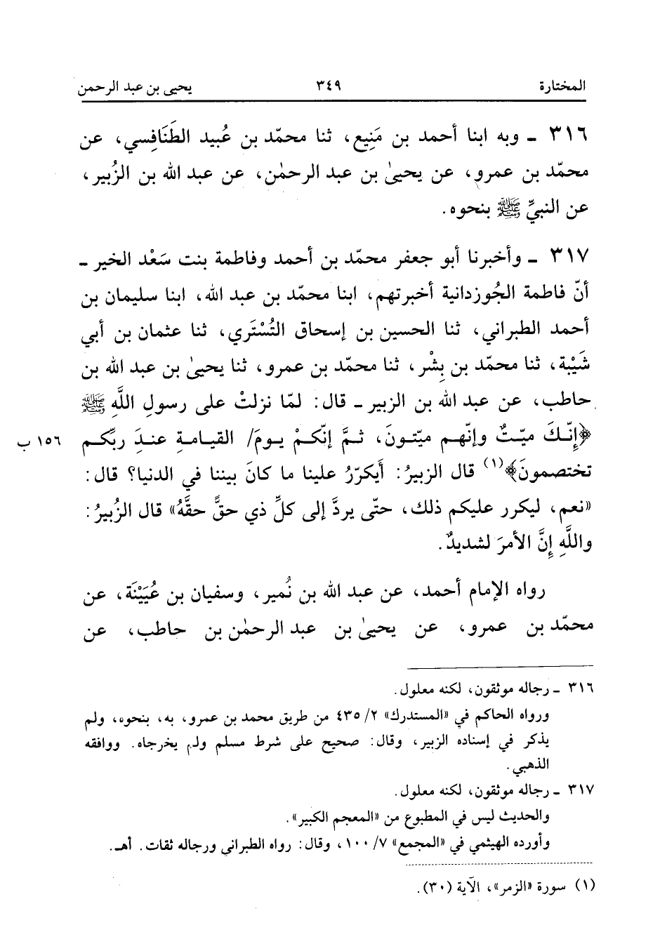 ٣١٧ - وَأَخْبَرَنَا أَبُو جَعْفَرٍ مُحَمَّدُ بْنُ أَحْمَدَ وَفَاطِمَةُ بِنْتُ سَعْدِ الْخَيْرِ، أَنَّ فَاطِمَةَ الْجُوزْدَانِيَّةَ أَخْبَرَتْهُمْ، أَبْنَا مُحَمَّدُ بْنُ عَبْدِ اللهِ، أَبْنَا سُلَيْمَانُ بْنُ أَحْمَدَ الطَّبَرَانِيُّ، ثَنَا الْحُسَيْنُ بْنُ إِسْحَاقَ التُّسْتَرِيُّ، ثَنَا عُثْمَانُ بْنُ أَبِي شَيْبَةَ، ثَنَا مُحَمَّدُ بْنُ بِشْرٍ، ثَنَا مُحَمَّدُ بْنُ عَمْرٍو، ثَنَا يَحْيَى بْنُ عَبْدِ اللهِ بْنِ حَاطِبٍ، عَنْ عَبْدِ اللهِ بْنِ الزُّبَيْرِ قَالَ: «لَمَّا نَزَلَتْ عَلَى رَسُولِ اللهِ صَلَّى اللهُ عَلَيْهِ وَسَلَّمَ: {إِنَّكَ مَيِّتٌ وَإِنَّهُمْ مَيِّتُونَ * ثُمَّ إِنَّكُمْ يَوْمَ الْقِيَامَةِ عِنْدَ رَبِّكُمْ تَخْتَصِمُونَ} قَالَ الزُّبَيْرُ: أَيُكَرَّرُ عَلَيْنَا مَا كَانَ بَيْنَنَا فِي الدُّنْيَا؟ قَالَ: نَعَمْ، لَيُكَرَّرُ عَلَيْكُمْ ذَلِكَ حَتَّى يُرَدَّ إِلَى كُلِّ ذِي حَقٍّ حَقُّهُ، قَالَ الزُّبَيْرُ: وَاللهِ إِنَّ الْأَمْرَ لَشَدِيدٌ».