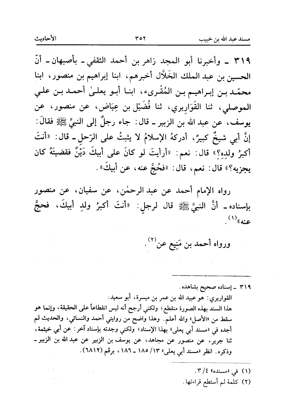 ٣١٩ - وَأَخْبَرَنَا أَبُو الْمَجْدِ زَاهِرُ بْنُ أَحْمَدَ الثَّقَفِيُّ - بِأَصْبَهَانَ - أَنَّ الْحُسَيْنَ بْنَ عَبْدِ الْمَلِكِ الْخَلَّالَ أَخْبَرَهُمْ، أَبْنَا إِبْرَاهِيمُ بْنُ مَنْصُورٍ، أَبْنَا مُحَمَّدُ بْنُ إِبْرَاهِيمَ بْنِ الْمُقْرِئِ، أَبْنَا أَبُو يَعْلَى أَحْمَدُ بْنُ عَلِيٍّ الْمَوْصِلِيُّ، ثَنَا الْقَوَارِيرِيُّ، ثَنَا فُضَيْلُ بْنُ عِيَاضٍ، عَنْ مَنْصُورٍ، عَنْ يُوسُفَ، عَنْ عَبْدِ اللهِ بْنِ الزُّبَيْرِ قَالَ: «جَاءَ رَجُلٌ إِلَى النَّبِيِّ صَلَّى اللهُ عَلَيْهِ وَسَلَّمَ فَقَالَ: إِنَّ أَبِي شَيْخٌ كَبِيرٌ أَدْرَكَهُ الْإِسْلَامُ لَا يَثْبُتُ عَلَى الرَّحْلِ، قَالَ: أَنْتَ أَكْبَرُ وَلَدِهِ؟ قَالَ: نَعَمْ، أَرَأَيْتَ لَوْ كَانَ عَلَى أَبِيكَ دَيْنٌ فَقَضَيْتَهُ كَانَ يَجْزِيهِ؟ قَالَ: نَعَمْ، قَالَ: فَحُجَّ عَنْهُ، عَنْ أَبِيكَ».