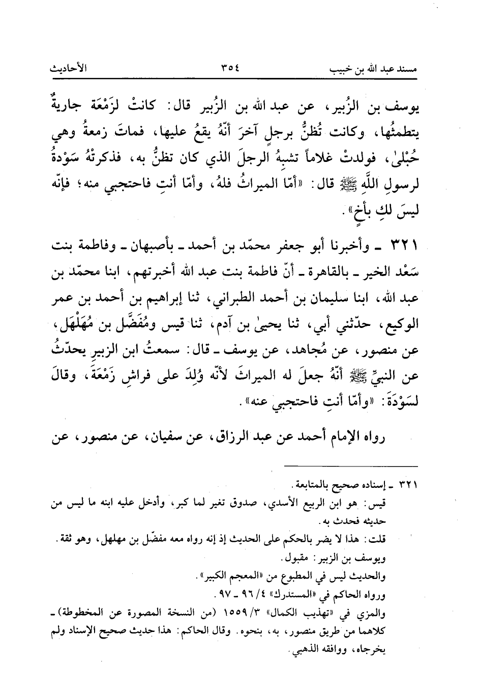 ٣٢١ - وَأَخْبَرَنَا أَبُو جَعْفَرٍ مُحَمَّدُ بْنُ أَحْمَدَ - بِأَصْبَهَانَ - وَفَاطِمَةُ بِنْتُ سَعْدِ الْخَيْرِ - بِالْقَاهِرَةِ - أَنَّ فَاطِمَةَ بِنْتَ عَبْدِ اللهِ أَخْبَرَتْهُمْ، أَبْنَا مُحَمَّدُ بْنُ عَبْدِ اللهِ، أَبْنَا سُلَيْمَانُ بْنُ أَحْمَدَ الطَّبَرَانِيُّ، ثَنَا إِبْرَاهِيمُ بْنُ أَحْمَدَ بْنِ عُمَرَ الْوَكِيعُ، حَدَّثَنِي أَبِي، ثَنَا يَحْيَى بْنُ آدَمَ، ثَنَا قَيْسٌ وَمُفَضَّلُ بْنُ مُهَلْهَلٍ، عَنْ مَنْصُورٍ، عَنْ مُجَاهِدٍ، عَنْ يُوسُفَ قَالَ: «سَمِعْتُ ابْنَ الزُّبَيْرِ يُحَدِّثُ عَنِ النَّبِيِّ صَلَّى اللهُ عَلَيْهِ وَسَلَّمَ أَنَّهُ جَعَلَ لَهُ الْمِيرَاثَ لِأَنَّهُ وُلِدَ عَلَى فِرَاشِ زَمْعَةَ، وَقَالَ لِسَوْدَةَ: وَأَمَّا أَنْتِ فَاحْتَجِبِي عَنْهُ».