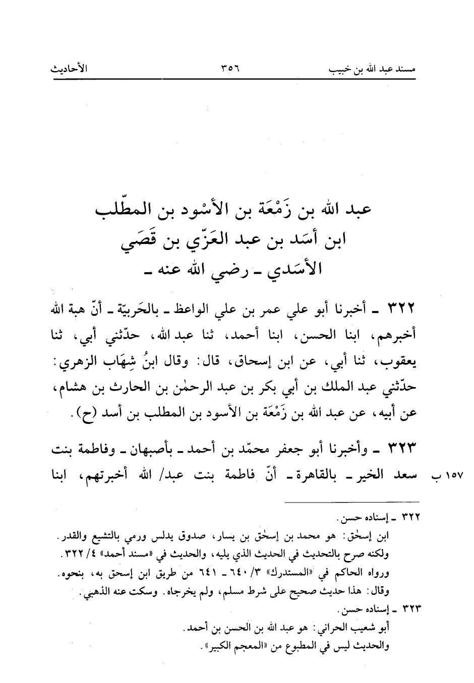 ٣٢٢ - أَخْبَرَنَا أَبُو عَلِيٍّ عُمَرُ بْنُ عَلِيٍّ الْوَاعِظُ - بِالْحَرْبِيَّةِ - أَنَّ هِبَةَ اللهِ أَخْبَرَهُمْ، أَبْنَا الْحَسَنُ، أَبْنَا أَحْمَدُ، ثَنَا عَبْدُ اللهِ، حَدَّثَنِي أَبِي، ثَنَا يَعْقُوبُ، ثَنَا أَبِي، عَنِ ابْنِ إِسْحَاقَ قَالَ: وَقَالَ ابْنُ شِهَابٍ الزُّهْرِيُّ: حَدَّثَنِي عَبْدُ الْمَلِكِ بْنُ أَبِي بَكْرِ بْنِ عَبْدِ الرَّحْمَنِ بْنِ الْحَارِثِ بْنِ هِشَامٍ، عَنْ أَبِيهِ، عَنْ عَبْدِ اللهِ بْنِ زَمْعَةَ بْنِ الْأَسْوَدِ بْنِ الْمُطَّلِبِ بْنِ أَسَدٍ (ح).