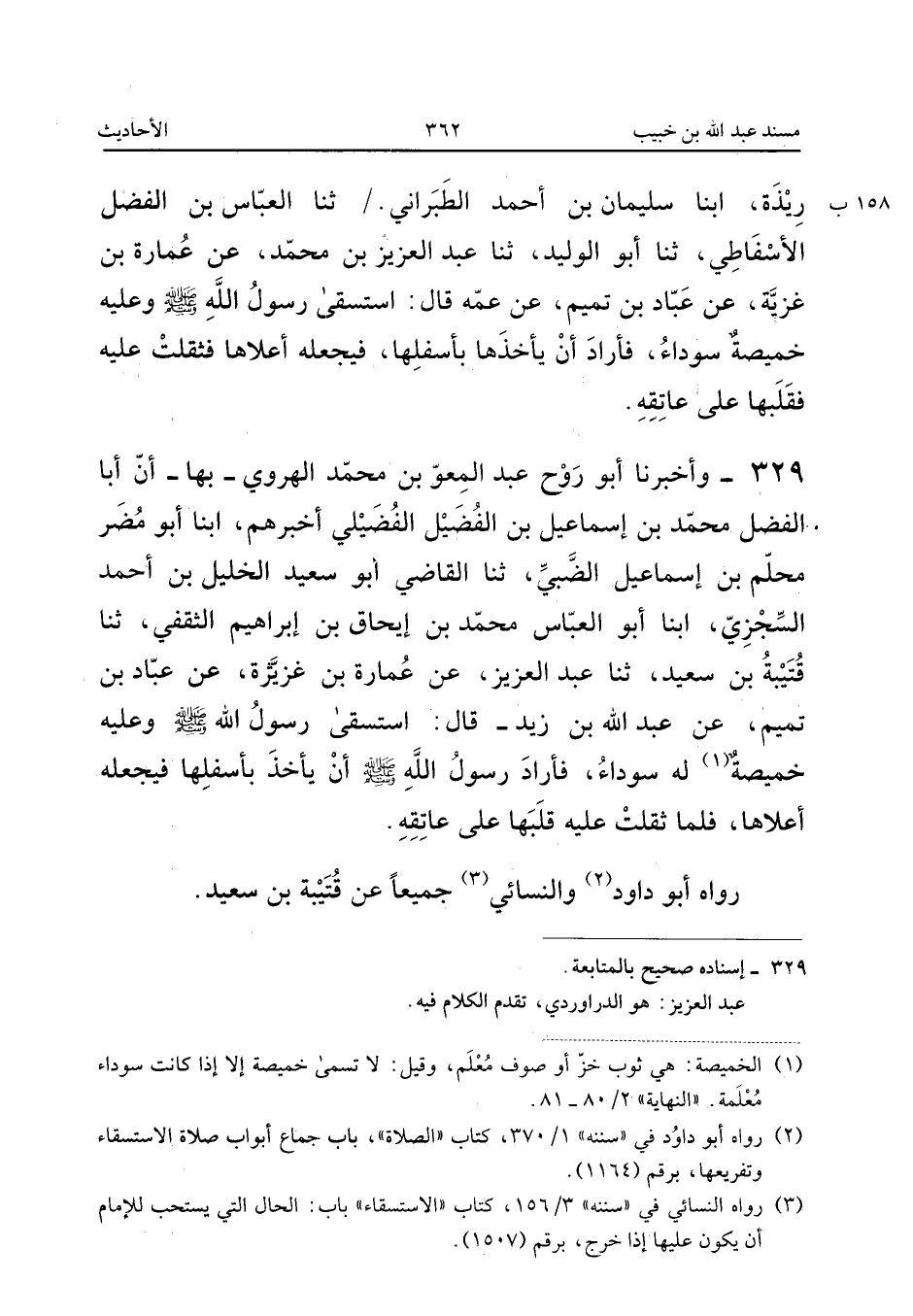 ٣٢٩ - وَأَخْبَرَنَا أَبُو رَوْحٍ عَبْدُ الْمُعِزِّ بْنُ مُحَمَّدٍ الْهَرَوِيُّ - بِهَا - أَنَّ أَبَا الْفَضْلِ مُحَمَّدَ بْنَ إِسْمَاعِيلَ بْنِ الْفُضَيْلِ الْفُضَيْلِيَّ أَخْبَرَهُمْ، أَبْنَا أَبُو مُضَرَ مُحَلِّمُ بْنُ إِسْمَاعِيلَ الضَّبِّيُّ، ثَنَا الْقَاضِي أَبُو سَعِيدٍ الْخَلِيلُ بْنُ أَحْمَدَ السِّجْزِيُّ، أَبْنَا أَبُو الْعَبَّاسِ مُحَمَّدُ بْنُ إِسْحَاقَ بْنِ إِبْرَاهِيمَ الثَّقَفِيُّ، ثَنَا قُتَيْبَةُ بْنُ سَعِيدٍ، ثَنَا عَبْدُ الْعَزِيزِ، عَنْ عُمَارَةَ بْنِ غَزِيَّةَ، عَنْ عَبَّادِ بْنِ تَمِيمٍ، عَنْ عَبْدِ اللهِ بْنِ زَيْدٍ قَالَ: «اسْتَسْقَى رَسُولُ اللهِ صَلَّى اللهُ عَلَيْهِ وَسَلَّمَ وَعَلَيْهِ خَمِيصَةٌ لَهُ سَوْدَاءُ، فَأَرَادَ رَسُولُ اللهِ صَلَّى اللهُ عَلَيْهِ وَسَلَّمَ أَنْ يَأْخُذَ بِأَسْفَلِهَا فَيَجْعَلَهُ أَعْلَاهَا، فَلَمَّا ثَقُلَتْ عَلَيْهِ قَلَبَهَا عَلَى عَاتِقِهِ».