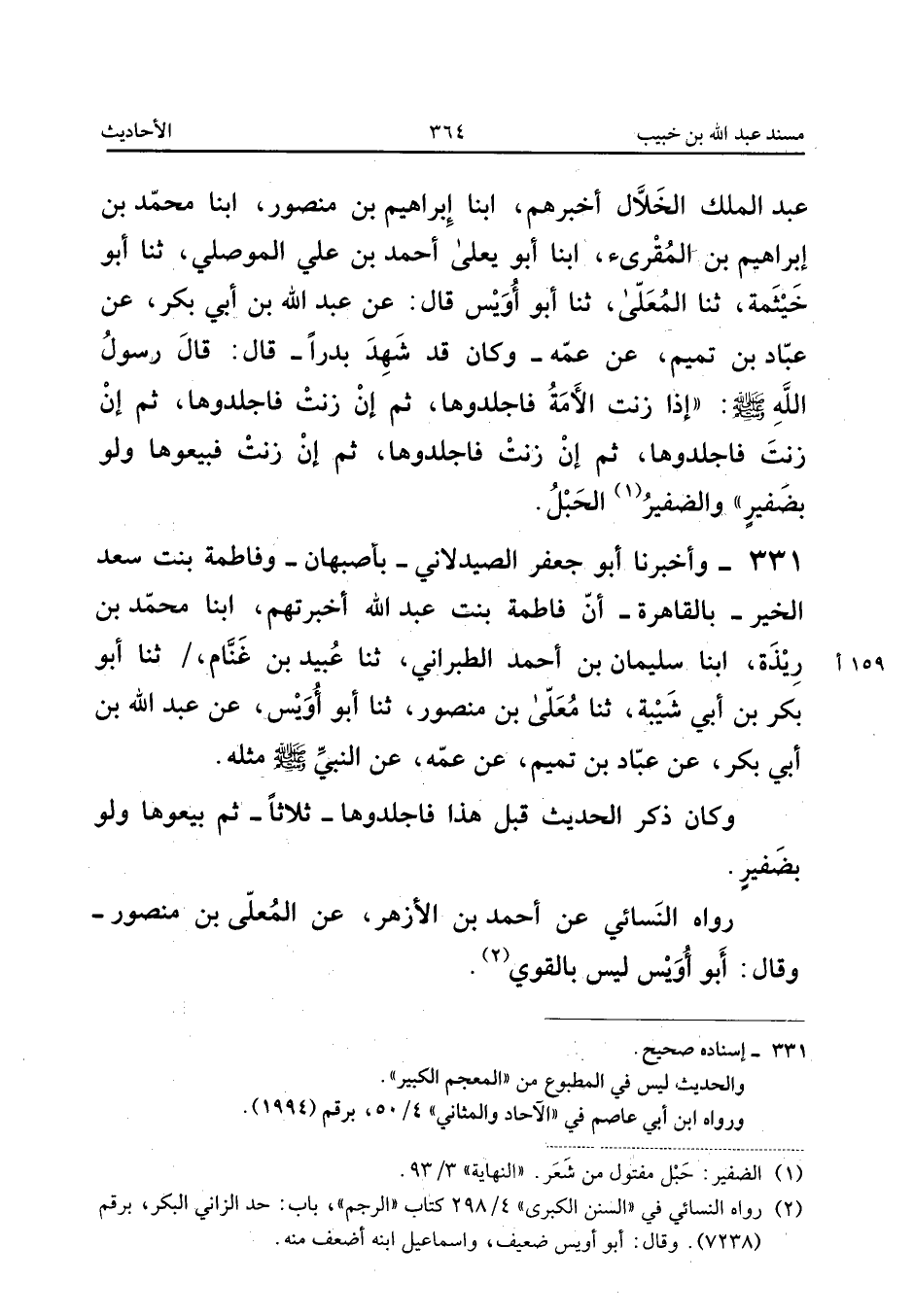 ٣٣١ - وَأَخْبَرَنَا أَبُو جَعْفَرٍ الصَّيْدَلَانِيُّ - بِأَصْبَهَانَ - وَفَاطِمَةُ بِنْتُ سَعْدِ الْخَيْرِ - بِالْقَاهِرَةِ - أَنَّ فَاطِمَةَ بِنْتَ عَبْدِ اللهِ أَخْبَرَتْهُمْ، أَبْنَا مُحَمَّدُ بْنُ رِيذَةَ، أَبْنَا سُلَيْمَانُ بْنُ أَحْمَدَ الطَّبَرَانِيُّ، ثَنَا عُبَيْدُ بْنُ غَنَّامٍ، ثَنَا أَبُو بَكْرِ بْنُ أَبِي شَيْبَةَ، ثَنَا مُعَلَّى بْنُ مَنْصُورٍ، ثَنَا أَبُو أُوَيْسٍ، عَنْ عَبْدِ اللهِ بْنِ أَبِي بَكْرٍ، عَنْ عَبَّادِ بْنِ تَمِيمٍ، عَنْ عَمِّهِ، عَنِ النَّبِيِّ صَلَّى اللهُ عَلَيْهِ وَسَلَّمَ مِثْلَهُ.