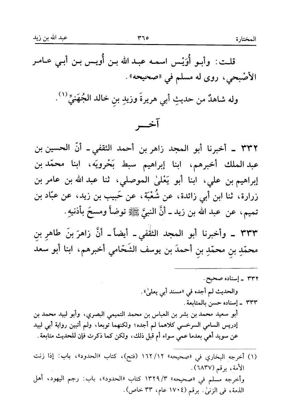 ٣٣٢ - أَخْبَرَنَا أَبُو الْمَجْدِ زَاهِرُ بْنُ أَحْمَدَ الثَّقَفِيُّ، أَنَّ الْحُسَيْنَ بْنَ عَبْدِ الْمَلِكِ أَخْبَرَهُمْ، أَبْنَا إِبْرَاهِيمُ سِبْطُ بَحْرَوَيْهِ، أَبْنَا مُحَمَّدُ بْنُ إِبْرَاهِيمَ بْنِ عَلِيٍّ، أَبْنَا أَبُو يَعْلَى الْمَوْصِلِيُّ، ثَنَا عَبْدُ اللهِ بْنُ عَامِرِ بْنِ زُرَارَةَ، ثَنَا ابْنُ أَبِي زَائِدَةَ، عَنْ شُعْبَةَ، عَنْ حَبِيبِ بْنِ زَيْدٍ، عَنْ عَبَّادِ بْنِ تَمِيمٍ، عَنْ عَبْدِ اللهِ بْنِ زَيْدٍ: «أَنَّ النَّبِيَّ صَلَّى اللهُ عَلَيْهِ وَسَلَّمَ تَوَضَّأَ وَمَسَحَ بِأُذُنَيْهِ».