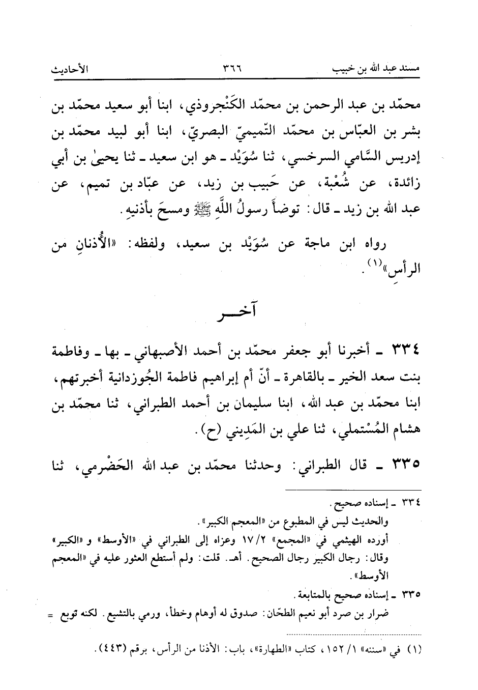 ٣٣٤ - أَخْبَرَنَا أَبُو جَعْفَرٍ مُحَمَّدُ بْنُ أَحْمَدَ الْأَصْبَهَانِيُّ - بِهَا - وَفَاطِمَةُ بِنْتُ سَعْدِ الْخَيْرِ - بِالْقَاهِرَةِ - أَنَّ أُمَّ إِبْرَاهِيمَ فَاطِمَةَ الْجُوزْدَانِيَّةَ أَخْبَرَتْهُمْ، أَبْنَا مُحَمَّدُ بْنُ عَبْدِ اللهِ، أَبْنَا سُلَيْمَانُ بْنُ أَحْمَدَ الطَّبَرَانِيُّ، ثَنَا مُحَمَّدُ بْنُ هِشَامٍ الْمُسْتَمْلِيُّ، ثَنَا عَلِيُّ بْنُ الْمَدِينِيِّ (ح).