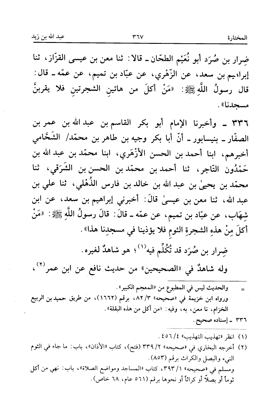٣٣٦ - وَأَخْبَرَنَا الْإِمَامُ أَبُو بَكْرٍ الْقَاسِمُ بْنُ عَبْدِ اللهِ بْنِ عُمَرَ بْنِ الصَّفَّارِ - بِنَيْسَابُورَ - أَنَّ أَبَا بَكْرٍ وَجِيهَ بْنَ طَاهِرِ بْنِ مُحَمَّدٍ الشَّحَّامِيَّ أَخْبَرَهُمْ، أَبْنَا أَحْمَدُ بْنُ الْحَسَنِ الْأَزْهَرِيُّ، أَبْنَا مُحَمَّدُ بْنُ عَبْدِ اللهِ بْنِ حَمْدُونٍ التَّاجِرُ، ثَنَا أَحْمَدُ بْنُ مُحَمَّدِ بْنِ الْحَسَنِ بْنِ الشَّرْقِيِّ، ثَنَا مُحَمَّدُ بْنُ يَحْيَى بْنِ عَبْدِ اللهِ بْنِ خَالِدِ بْنِ فَارِسٍ الذُّهْلِيُّ، ثَنَا عَلِيُّ بْنُ عَبْدِ اللهِ، ثَنَا مَعْنُ بْنُ عِيسَى قَالَ: أَخْبَرَنِي إِبْرَاهِيمُ بْنُ سَعْدٍ، عَنِ ابْنِ شِهَابٍ، عَنْ عَبَّادِ بْنِ تَمِيمٍ، عَنْ عَمِّهِ قَالَ: قَالَ رَسُولُ اللهِ صَلَّى اللهُ عَلَيْهِ وَسَلَّمَ: «مَنْ أَكَلَ مِنْ هَذِهِ الشَّجَرَةِ الثُّومِ فَلَا يُؤْذِينَا فِي مَسْجِدِنَا هَذَا».