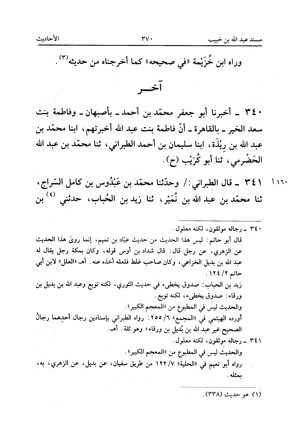 ٣٤١ - قَالَ الطَّبَرَانِيُّ: وَحَدَّثَنَا مُحَمَّدُ بْنُ عَبْدُوسِ بْنِ كَامِلٍ السَّرَّاجُ، ثَنَا مُحَمَّدُ بْنُ عَبْدِ اللهِ بْنِ نُمَيْرٍ، ثَنَا زَيْدُ بْنُ الْحُبَابِ، حَدَّثَنِي ابْنُ