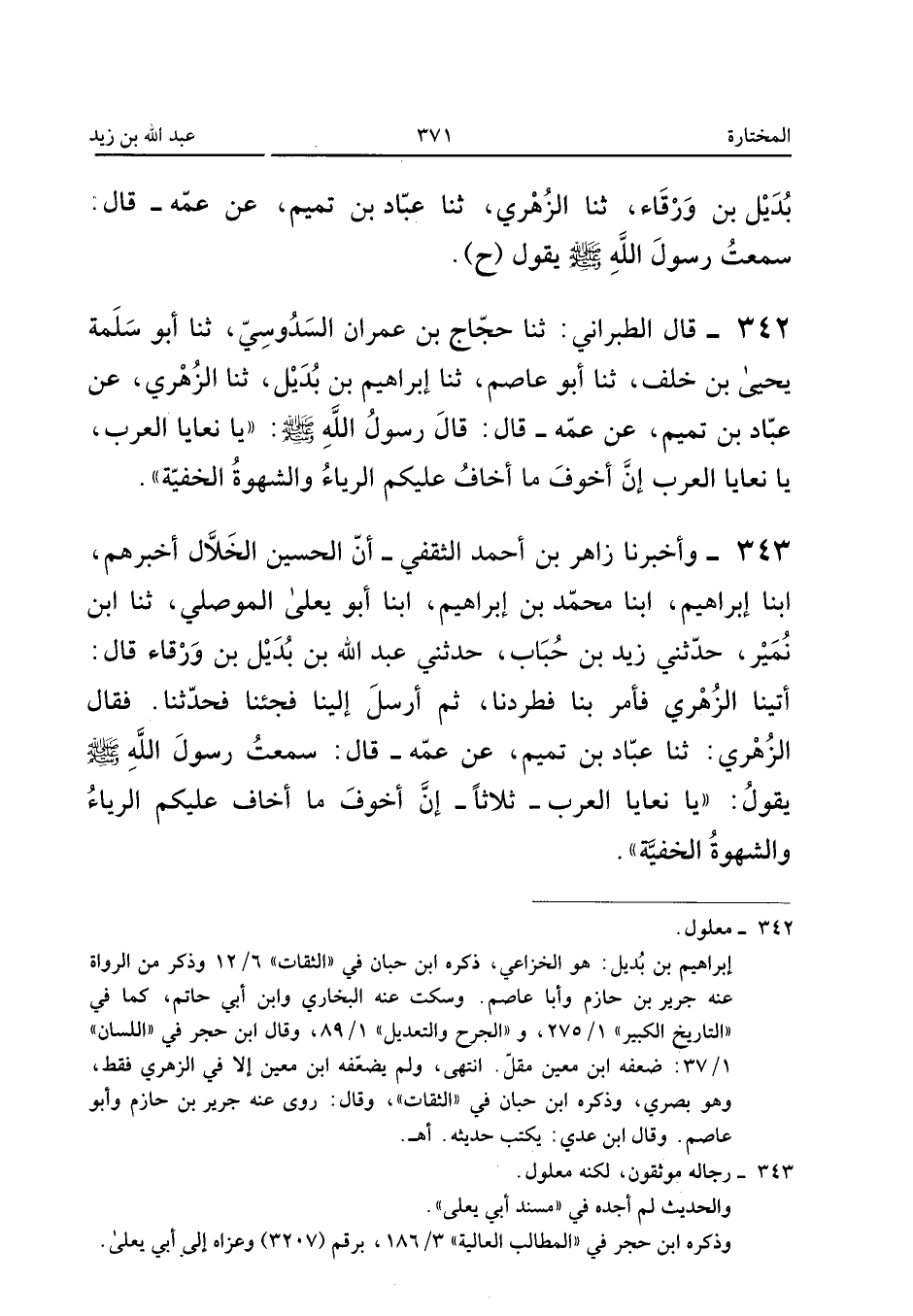 ٣٤٣ - وَأَخْبَرَنَا زَاهِرُ بْنُ أَحْمَدَ الثَّقَفِيُّ، أَنَّ الْحُسَيْنَ الْخَلَّالَ أَخْبَرَهُمْ، أَبْنَا إِبْرَاهِيمُ، أَبْنَا مُحَمَّدُ بْنُ إِبْرَاهِيمَ، أَبْنَا أَبُو يَعْلَى الْمَوْصِلِيُّ، ثَنَا ابْنُ نُمَيْرٍ حَدَّثَنِي زَيْدُ بْنُ حُبَابٍ، حَدَّثَنِي عَبْدُ اللهِ بْنُ بُدَيْلِ بْنِ وَرْقَاءَ قَالَ: أَتَيْنَا الزُّهْرِيَّ فَأَمَرَ بِنَا فَطُرِدْنَا، ثُمَّ أَرْسَلَ إِلَيْنَا فَجِئْنَا فَحَدَّثَنَا، فَقَالَ الزُّهْرِيُّ: ثَنَا عَبَّادُ بْنُ تَمِيمٍ، عَنْ عَمِّهِ قَالَ: سَمِعْتُ رَسُولَ اللهِ صَلَّى اللهُ عَلَيْهِ وَسَلَّمَ يَقُولُ: «يَا نَعَايَا الْعَرَبِ - ثَلَاثًا - إِنَّ أَخْوَفَ مَا أَخَافُ عَلَيْكُمُ الرِّيَاءُ وَالشَّهْوَةُ الْخَفِيَّةُ».