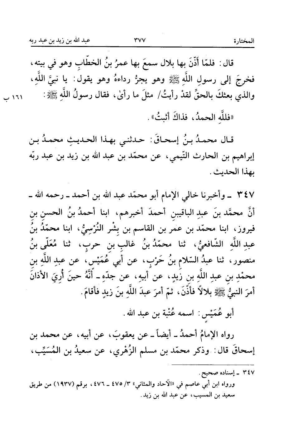 ٣٤٧ - وَأَخْبَرَنَا خَالِيَ الْإِمَامُ أَبُو مُحَمَّدٍ عَبْدُ اللهِ بْنُ أَحْمَدَ - رَحِمَهُ اللهُ - أَنَّ مُحَمَّدَ بْنَ عَبْدِ الْبَاقِي بْنِ أَحْمَدَ أَخْبَرَهُمْ، أَبْنَا أَحْمَدُ بْنُ الْحَسَنِ بْنِ فَيْرُوزَ، أَبْنَا مُحَمَّدُ بْنُ عُمَرَ بْنِ الْقَاسِمِ بْنِ بِشْرٍ النَّرْسِيُّ، أَبْنَا مُحَمَّدُ بْنُ عَبْدِ اللهِ الشَّافِعِيُّ، ثَنَا مُحَمَّدُ بْنُ غَالِبِ بْنِ حَرْبٍ، ثَنَا مُعَلَّى بْنُ مَنْصُورٍ، ثَنَا عَبْدُ السَّلَامِ بْنُ حَرْبٍ، عَنْ أَبِي عُمَيْسٍ، عَنْ عَبْدِ اللهِ بْنِ مُحَمَّدِ بْنِ عَبْدِ اللهِ بْنِ زَيْدٍ، عَنْ أَبِيهِ، عَنْ جَدِّهِ: «أَنَّهُ حِينَ أُرِيَ الْأَذَانَ أَمَرَ النَّبِيُّ صَلَّى اللهُ عَلَيْهِ وَسَلَّمَ بِلَالًا فَأَذَّنَ، ثُمَّ أَمَرَ عَبْدَ اللهِ بْنَ زَيْدٍ فَأَقَامَ».
