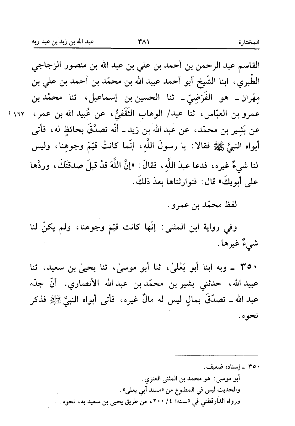 ٣٥٠ - وَبِهِ، أَبْنَا أَبُو يَعْلَى، ثَنَا أَبُو مُوسَى، ثَنَا يَحْيَى بْنُ سَعِيدٍ، ثَنَا عُبَيْدُ اللهِ، حَدَّثَنِي بَشِيرُ بْنُ مُحَمَّدِ بْنِ عَبْدِ اللهِ الْأَنْصَارِيُّ، «أَنَّ جَدَّهُ عَبْدَ اللهِ تَصَدَّقَ بِمَالٍ لَيْسَ لَهُ مَالٌ غَيْرُهُ، فَأَتَى أَبَوَاهُ النَّبِيَّ صَلَّى اللهُ عَلَيْهِ وَسَلَّمَ»، فَذَكَرَ نَحْوَهُ.