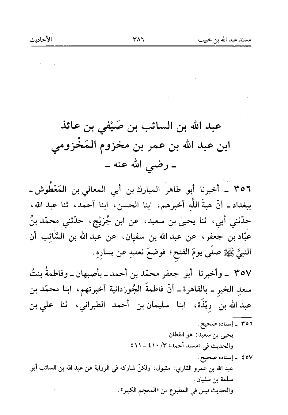 ٣٥٦ - أَخْبَرَنَا أَبُو طَاهِرٍ الْمُبَارَكُ بْنُ أَبِي الْمَعَالِي بْنِ الْمَعْطُوشِ - بِبَغْدَادَ - أَنَّ هِبَةَ اللهِ أَخْبَرَهُمْ، أَبْنَا الْحَسَنُ، أَبْنَا أَحْمَدُ، ثَنَا عَبْدُ اللهِ، حَدَّثَنِي أَبِي، ثَنَا يَحْيَى بْنُ سَعِيدٍ، عَنِ ابْنِ جُرَيْجٍ، حَدَّثَنِي مُحَمَّدُ بْنُ عَبَّادِ بْنِ جَعْفَرٍ، عَنْ عَبْدِ اللهِ بْنِ سُفْيَانَ، عَنْ عَبْدِ اللهِ بْنِ السَّائِبِ «أَنَّ النَّبِيَّ صَلَّى اللهُ عَلَيْهِ وَسَلَّمَ صَلَّى يَوْمَ الْفَتْحِ، فَوَضَعَ نَعْلَيْهِ عَنْ يَسَارِهِ».