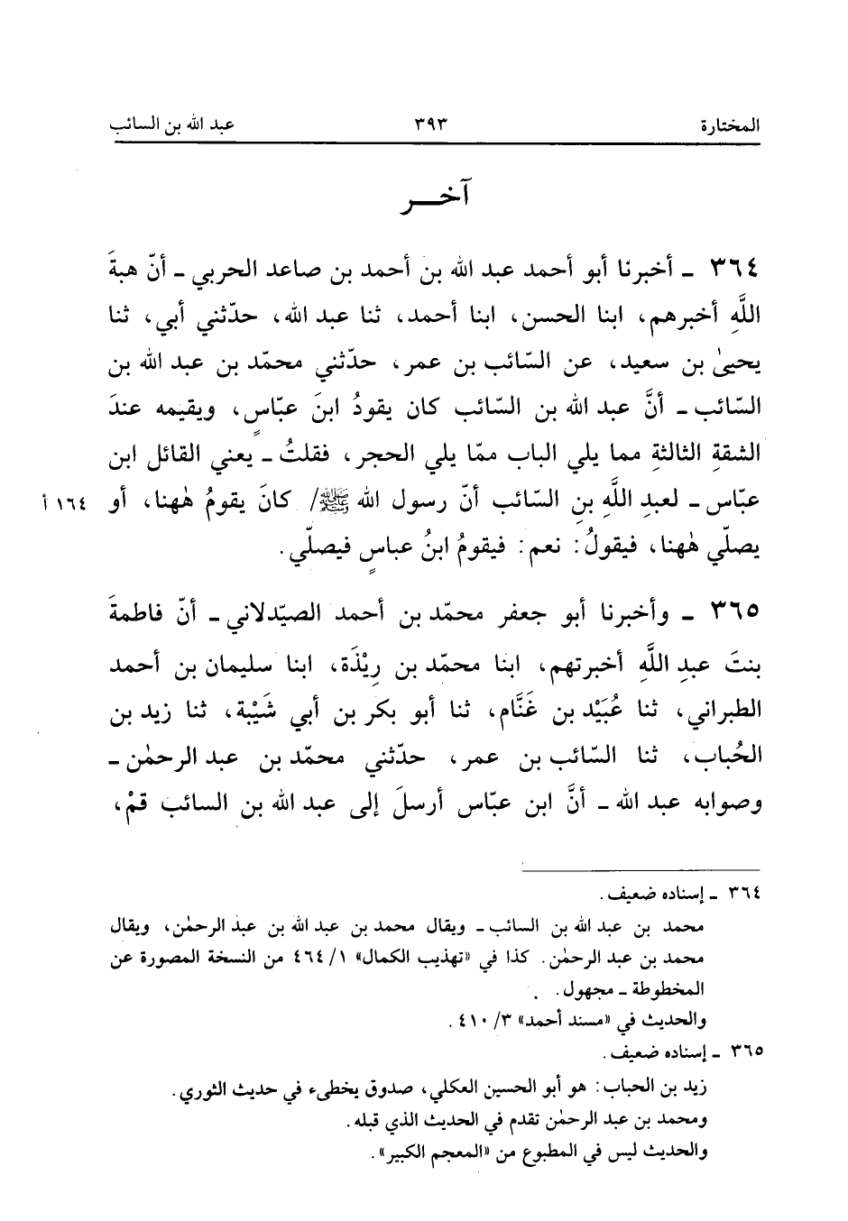 ٣٦٤ - أَخْبَرَنَا أَبُو أَحْمَدَ عَبْدُ اللهِ بْنُ أَحْمَدَ بْنِ صَاعِدٍ الْحَرْبِيُّ، أَنَّ هِبَةَ اللهِ أَخْبَرَهُمْ، أَبْنَا الْحَسَنُ، أَبْنَا أَحْمَدُ، ثَنَا عَبْدُ اللهِ، حَدَّثَنِي أَبِي، ثَنَا يَحْيَى بْنُ سَعِيدٍ، عَنِ السَّائِبِ بْنِ عُمَرَ، حَدَّثَنِي مُحَمَّدُ بْنُ عَبْدِ اللهِ بْنِ السَّائِبِ: «أَنَّ عَبْدَ اللهِ بْنَ السَّائِبِ كَانَ يَقُودُ ابْنَ عَبَّاسٍ وَيُقِيمُهُ عِنْدَ الشُّقَّةِ الثَّالِثَةِ مِمَّا يَلِي الْبَابَ مِمَّا يَلِي الْحَجَرَ، فَقُلْتُ - يَعْنِيَ الْقَائِلَ ابْنَ عَبَّاسٍ - لِعَبْدِ اللهِ بْنِ السَّائِبِ: إِنَّ رَسُولَ اللهِ صَلَّى اللهُ عَلَيْهِ وَسَلَّمَ كَانَ يَقُومُ هَهُنَا، أَوْ يُصَلِّي هَهُنَا، فَيَقُولُ: نَعَمْ، فَيَقُومُ ابْنُ عَبَّاسٍ فَيُصَلِّي».