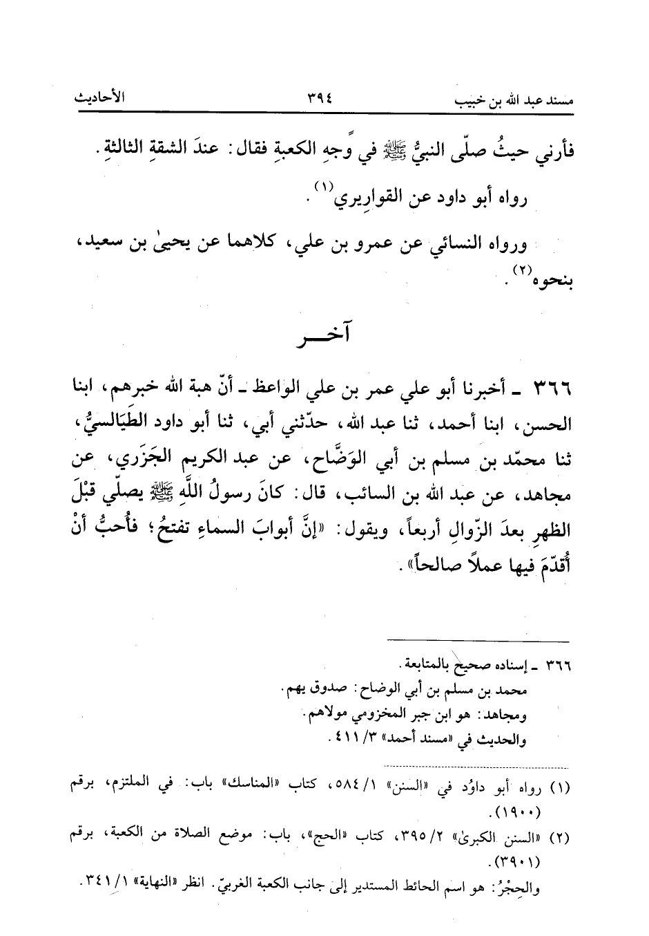 ٣٦٦ - أَخْبَرَنَا أَبُو عَلِيٍّ عُمَرُ بْنُ عَلِيٍّ الْوَاعِظُ، أَنَّ هِبَةَ اللهِ خَبَّرَهُمْ، أَبْنَا الْحَسَنُ، أَبْنَا أَحْمَدُ، ثَنَا عَبْدُ اللهِ، حَدَّثَنِي أَبِي، ثَنَا أَبُو دَاوُدَ الطَّيَالِسِيُّ، ثَنَا مُحَمَّدُ بْنُ مُسْلِمِ بْنِ أَبِي الْوَضَّاحِ، عَنْ عَبْدِ الْكَرِيمِ الْجَزَرِيِّ، عَنْ مُجَاهِدٍ، عَنْ عَبْدِ اللهِ بْنِ السَّائِبِ قَالَ: «كَانَ رَسُولُ اللهِ صَلَّى اللهُ عَلَيْهِ وَسَلَّمَ يُصَلِّي قَبْلَ الظُّهْرِ بَعْدَ الزَّوَالِ أَرْبَعًا وَيَقُولُ: إِنَّ أَبْوَابَ السَّمَاءِ تُفْتَحُ، فَأُحِبُّ أَنْ أُقَدِّمَ فِيهَا عَمَلًا صَالِحًا».