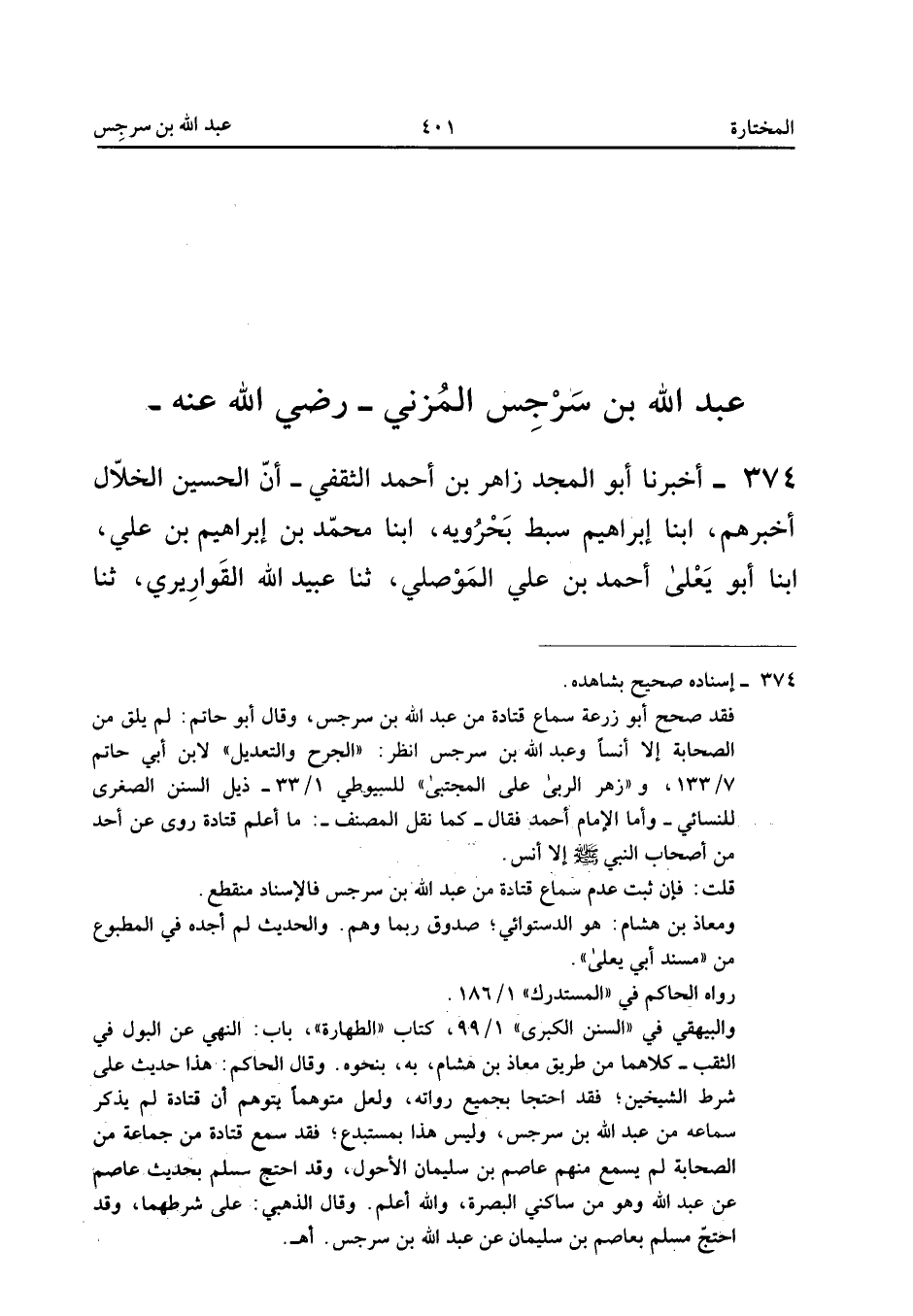 ٣٧٤ - أَخْبَرَنَا أَبُو الْمَجْدِ زَاهِرُ بْنُ أَحْمَدَ الثَّقَفِيُّ، أَنَّ الْحُسَيْنَ الْخَلَّالَ أَخْبَرَهُمْ، أَبْنَا إِبْرَاهِيمُ سِبْطُ بَحْرَوَيْهِ، أَبْنَا مُحَمَّدُ بْنُ إِبْرَاهِيمَ بْنِ عَلِيٍّ، أَبْنَا أَبُو يَعْلَى أَحْمَدُ بْنُ عَلِيٍّ الْمَوْصِلِيُّ، ثَنَا عُبَيْدُ اللهِ الْقَوَارِيرِيُّ، ثَنَا
