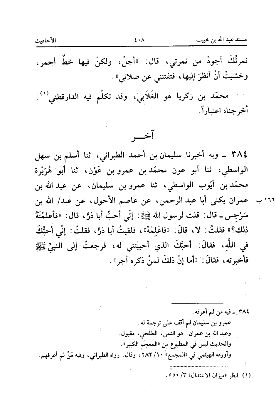 ٣٨٤ - وَبِهِ أَخْبَرَنَا سُلَيْمَانُ بْنُ أَحْمَدَ الطَّبَرَانِيُّ، ثَنَا أَسْلَمُ بْنُ سَهْلٍ الْوَاسِطِيُّ، ثَنَا أَبُو عَوْنٍ مُحَمَّدُ بْنُ عَمْرِو بْنِ عَوْنٍ، ثَنَا أَبُو هُرَيْرَةَ مُحَمَّدُ بْنُ أَيُّوبَ الْوَاسِطِيُّ، ثَنَا عَمْرُو بْنُ سُلَيْمَانَ، عَنْ عَبْدِ اللهِ بْنِ عِمْرَانَ - يُكَنَّى أَبَا عَبْدِ الرَّحْمَنِ - عَنْ عَاصِمٍ الْأَحْوَلِ، عَنْ عَبْدِ اللهِ بْنِ سَرْجِسَ قَالَ: «قُلْتُ لِرَسُولِ اللهِ صَلَّى اللهُ عَلَيْهِ وَسَلَّمَ: إِنِّي أُحِبُّ أَبَا ذَرٍّ، قَالَ: فَأَعْلَمْتَهُ ذَلِكَ؟ فَقُلْتُ: لَا، قَالَ: فَأَعْلِمْهُ، فَلَقِيتُ أَبَا ذَرٍّ فَقُلْتُ: إِنِّي أُحِبُّكَ فِي اللهِ، فَقَالَ: أَحَبَّكَ الَّذِي أَحْبَبْتَنِي لَهُ، فَرَجَعْتُ إِلَى النَّبِيِّ صَلَّى اللهُ عَلَيْهِ وَسَلَّمَ فَأَخْبَرْتُهُ، فَقَالَ: أَمَا إِنَّ ذَلِكَ لِمَنْ ذَكَرَهُ أَجْرٌ».