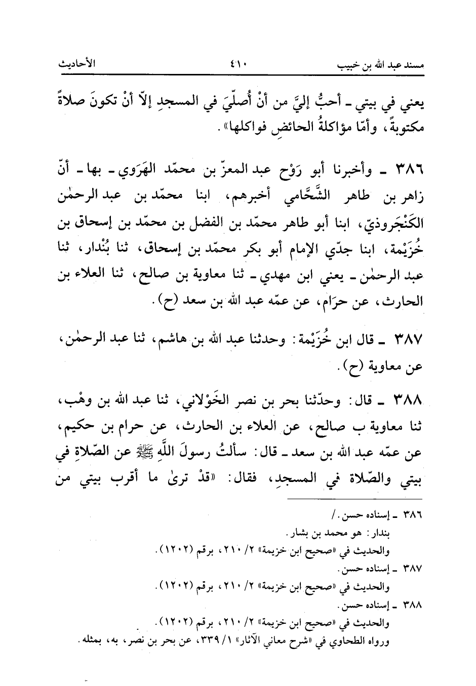 ٣٨٦ - وَأَخْبَرَنَا أَبُو رَوْحٍ عَبْدُ الْمُعِزِّ بْنُ مُحَمَّدٍ الْهَرَوِيُّ - بِهَا - أَنَّ زَاهِرَ بْنَ طَاهِرٍ الشَّحَّامِيَّ أَخْبَرَهُمْ، أَبْنَا مُحَمَّدُ بْنُ عَبْدِ الرَّحْمَنِ الْكَنْجَرُوذِيُّ، أَبْنَا أَبُو طَاهِرٍ مُحَمَّدُ بْنُ الْفَضْلِ بْنِ مُحَمَّدِ بْنِ إِسْحَاقَ بْنِ خُزَيْمَةَ، أَبْنَا جَدِّي الْإِمَامُ أَبُو بَكْرٍ مُحَمَّدُ بْنُ إِسْحَاقَ، ثَنَا بُنْدَارٌ، ثَنَا عَبْدُ الرَّحْمَنِ - يَعْنِي ابْنَ مَهْدِيٍّ - ثَنَا مُعَاوِيَةُ بْنُ صَالِحٍ، ثَنَا الْعَلَاءُ بْنُ الْحَارِثِ، عَنْ حَرَامٍ، عَنْ عَمِّهِ عَبْدِ اللهِ بْنِ سَعْدٍ (ح).