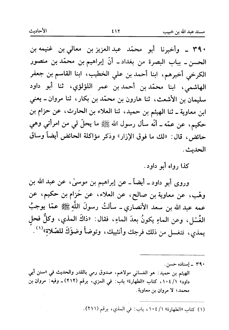 ٣٩٠ - وَأَخْبَرَنَا أَبُو مُحَمَّدٍ عَبْدُ الْعَزِيزِ بْنُ مَعَالِي بْنِ غَنِيمَةَ بْنِ الْحَسَنِ - بِبَابِ الْبَصْرَةِ مِنْ بَغْدَادَ - أَنَّ إِبْرَاهِيمَ بْنَ مُحَمَّدِ بْنِ مَنْصُورٍ الْكَرْخِيَّ أَخْبَرَهُمْ، أَبْنَا أَحْمَدُ بْنُ عَلِيٍّ الْخَطِيبُ، أَبْنَا الْقَاسِمُ بْنُ جَعْفَرٍ الْهَاشِمِيُّ، أَبْنَا مُحَمَّدُ بْنُ أَحْمَدَ بْنِ عُمَرَ اللُّؤْلُؤِيُّ، ثَنَا أَبُو دَاوُدَ سُلَيْمَانُ بْنُ الْأَشْعَثِ، ثَنَا هَارُونُ بْنُ مُحَمَّدِ بْنِ بَكَّارٍ، ثَنَا مَرْوَانُ - يَعْنِي ابْنَ مُعَاوِيَةَ - ثَنَا الْهَيْثَمُ بْنُ حُمَيْدٍ، ثَنَا الْعَلَاءُ بْنُ الْحَارِثِ، عَنْ حِزَامِ بْنِ حَكِيمٍ، عَنْ عَمِّهِ أَنَّهُ «سَأَلَ رَسُولَ اللهِ صَلَّى اللهُ عَلَيْهِ وَسَلَّمَ: مَا يَحِلُّ لِي مِنِ امْرَأَتِي وَهِيَ حَائِضٌ، قَالَ: لَكَ مَا فَوْقَ الْإِزَارِ، وَذَكَرَ مُؤَاكَلَةَ الْحَائِضِ» أَيْضًا وَسَاقَ الْحَدِيثَ.