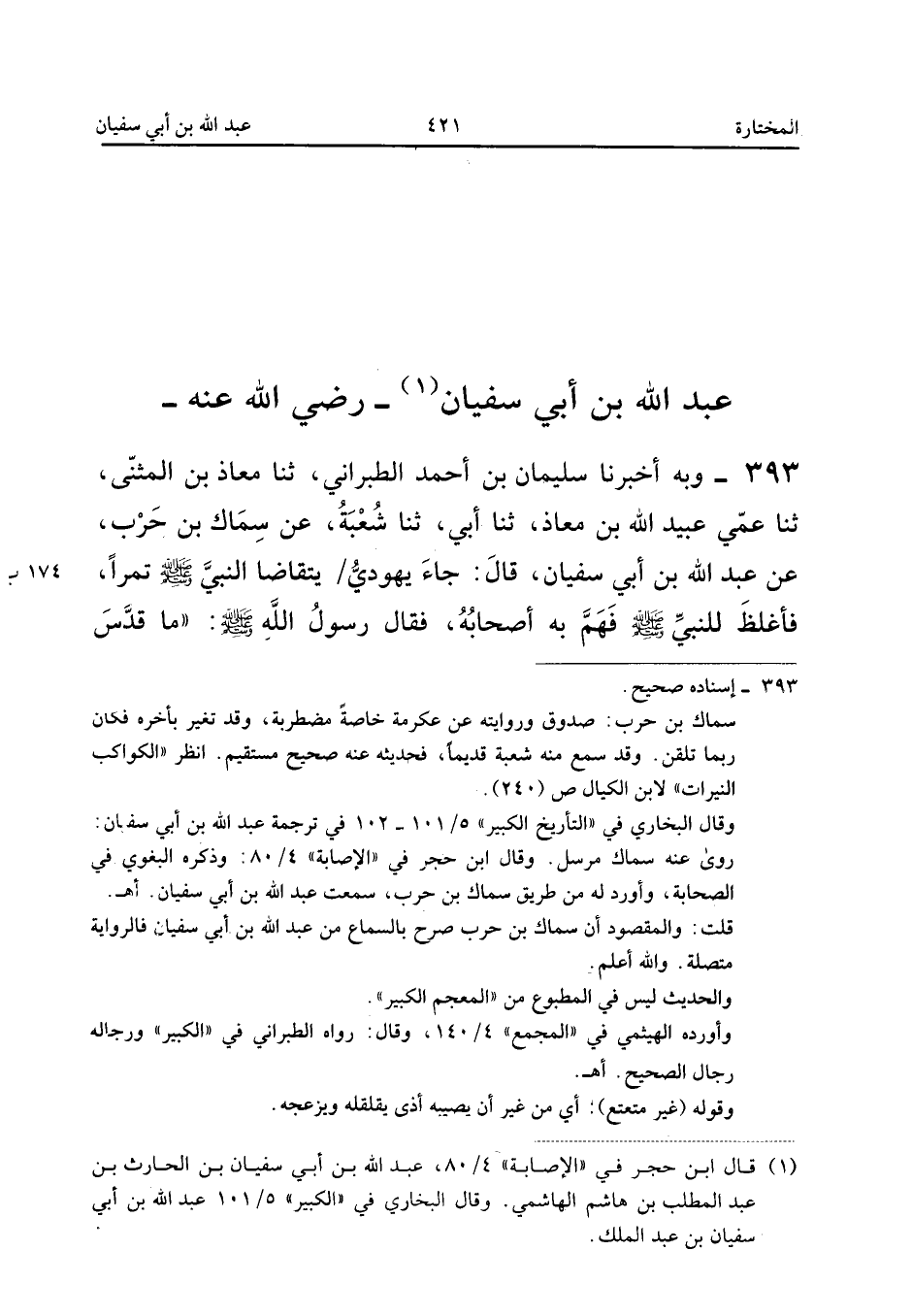 ٣٩٣ - وَبِهِ أَخْبَرَنَا سُلَيْمَانُ بْنُ أَحْمَدَ الطَّبَرَانِيُّ، ثَنَا مُعَاذُ بْنُ الْمُثَنَّى، ثَنَا عَمِّي عُبَيْدُ اللهِ بْنُ مُعَاذٍ، ثَنَا أَبِي، ثَنَا شُعْبَةُ، عَنْ سِمَاكِ بْنِ حَرْبٍ، عَنْ عَبْدِ اللهِ بْنِ أَبِي سُفْيَانَ قَالَ: «جَاءَ يَهُودِيٌّ يَتَقَاضَى النَّبِيَّ صَلَّى اللهُ عَلَيْهِ وَسَلَّمَ تَمْرًا، فَأَغْلَظَ لِلنَّبِيِّ صَلَّى اللهُ عَلَيْهِ وَسَلَّمَ، فَهَمَّ بِهِ أَصْحَابُهُ، فَقَالَ رَسُولُ اللهِ صَلَّى اللهُ عَلَيْهِ وَسَلَّمَ: مَا قَدَّسَ