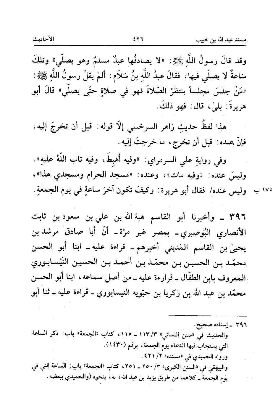 عَبْدِ الرَّحْمَنِ أَحْمَدُ بْنُ شُعَيْبِ بْنِ عَلِيٍّ النَّسَائِيُّ - لَفْظًا قِرَاءَةً عَلَيْنَا مِنْ كِتَابِهِ - أَبْنَا قُتَيْبَةُ بْنُ سَعِيدٍ، أَبْنَا بَكْرٌ - وَهُوَ ابْنُ مُضَرَ - عَنِ ابْنِ الْهَادِ، عَنْ مُحَمَّدِ بْنِ إِبْرَاهِيمَ، عَنْ أَبِي سَلَمَةَ بْنِ عَبْدِ اللهِ، عَنْ أَبِي هُرَيْرَةَ قَالَ: «أَتَيْتُ الطُّورَ فَوَجَدْتُ كَعْبًا فَمَكَثْتُ أَنَا وَهُوَ يَوْمًا أُحَدِّثُهُ عَنْ رَسُولِ اللهِ صَلَّى اللهُ عَلَيْهِ وَسَلَّمَ، وَيُحَدِّثُنِي عَنِ التَّوْرَاةِ، فَقُلْتُ لَهُ: قَالَ رَسُولُ اللهِ صَلَّى اللهُ عَلَيْهِ وَسَلَّمَ: خَيْرُ يَوْمٍ طَلَعَتْ عَلَيْهِ الشَّمْسُ يَوْمُ الْجُمُعَةِ، فِيهِ خُلِقَ آدَمُ وَفِيهِ أُهْبِطَ وَفِيهِ تِيبَ عَلَيْهِ وَفِيهِ قُبِضَ وَفِيهِ تَقُومُ السَّاعَةُ، مَا عَلَى مَتْنِ الْأَرْضِ مِنْ دَابَّةٍ إِلَّا وَهِيَ تُصْبِحُ يَوْمَ الْجُمُعَةِ مُصِيخَةً حَتَّى تَطْلُعَ الشَّمْسُ؛ شَفَقًا مِنَ السَّاعَةِ، إِلَّا ابْنَ آدَمَ، وَفِيهِ سَاعَةٌ لَا يُصَادِفُهَا مُؤْمِنٌ وَهُوَ فِي الصَّلَاةِ يَسْأَلُ اللهَ شَيْئًا إِلَّا أَعْطَاهُ إِيَّاهُ، قَالَ كَعْبٌ: ذَلِكَ يَوْمٌ فِي كُلِّ سَنَةٍ، فَقُلْتُ: بَلْ هُوَ فِي كُلِّ جُمُعَةٍ، فَقَرَأَ كَعْبٌ ثُمَّ قَالَ: صَدَقَ رَسُولُ اللهِ صَلَّى اللهُ عَلَيْهِ وَسَلَّمَ هُوَ فِي كُلِّ جُمُعَةٍ.
