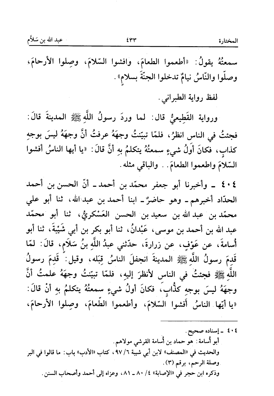 ٤٠٤ - وَأَخْبَرَنَا أَبُو جَعْفَرٍ مُحَمَّدُ بْنُ أَحْمَدَ، أَنَّ الْحَسَنَ بْنَ أَحْمَدَ الْحَدَّادَ أَخْبَرَهُمْ، وَهُوَ حَاضِرٌ، أَبْنَا أَحْمَدُ بْنُ عَبْدِ اللهِ، ثَنَا أَبُو عَلِيٍّ مُحَمَّدُ بْنُ عَبْدِ اللهِ بْنِ سَعِيدِ بْنِ الْحَسَنِ الْعَسْكَرِيُّ، ثَنَا أَبُو مُحَمَّدٍ عَبْدُ اللهِ بْنُ أَحْمَدَ بْنِ مُوسَى، عَبْدَانُ، ثَنَا أَبُو بَكْرِ بْنُ أَبِي شَيْبَةَ، ثَنَا أَبُو أُسَامَةَ، عَنْ عَوْفٍ، عَنْ زُرَارَةَ، حَدَّثَنِي عَبْدُ اللهِ بْنُ سَلَامٍ قَالَ: «لَمَّا قَدِمَ رَسُولُ اللهِ صَلَّى اللهُ عَلَيْهِ وَسَلَّمَ الْمَدِينَةَ انْجَفَلَ النَّاسُ قِبَلَهُ، وَقِيلَ: قَدِمَ رَسُولُ اللهِ صَلَّى اللهُ عَلَيْهِ وَسَلَّمَ، فَجِئْتُ فِي النَّاسِ لِأَنْظُرَ إِلَيْهِ، فَلَمَّا تَبَيَّنْتُ وَجْهَهُ عَلِمْتُ أَنَّ وَجْهَهُ لَيْسَ بِوَجْهِ كَذَّابٍ، فَكَانَ أَوَّلَ شَيْءٍ سَمِعْتُهُ يَتَكَلَّمُ بِهِ أَنْ قَالَ: يَا أَيُّهَا النَّاسُ أَفْشُوا السَّلَامَ وَأَطْعِمُوا الطَّعَامَ وَصِلُوا الْأَرْحَامَ