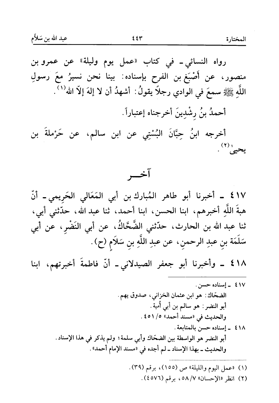٤١٧ - أَخْبَرَنَا أَبُو طَاهِرٍ الْمُبَارَكُ بْنُ أَبِي الْمَعَالِي الْحَرِيمِيُّ، أَنَّ هِبَةَ اللهِ أَخْبَرَهُمْ، أَبْنَا الْحَسَنُ، أَبْنَا أَحْمَدُ، ثَنَا عَبْدُ اللهِ، حَدَّثَنِي أَبِي، ثَنَا عَبْدُ اللهِ بْنُ الْحَارِثِ، حَدَّثَنِي الضَّحَّاكُ، عَنْ أَبِي النَّضْرِ، عَنْ أَبِي سَلَمَةَ بْنِ عَبْدِ الرَّحْمَنِ، عَنْ عَبْدِ اللهِ بْنِ سَلَامٍ (ح).