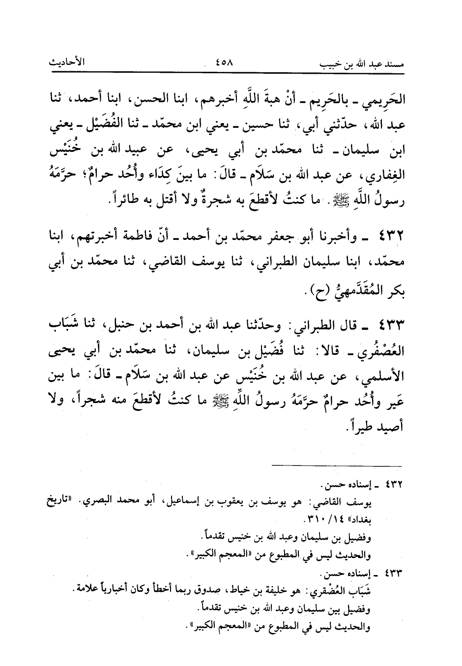 ٤٣٣ - قَالَ الطَّبَرَانِيُّ: وَحَدَّثَنَا عَبْدُ اللهِ بْنُ أَحْمَدَ بْنِ حَنْبَلٍ، ثَنَا شَبَابٌ الْعُصْفُرِيُّ قَالَا: ثَنَا فُضَيْلُ بْنُ سُلَيْمَانَ، ثَنَا مُحَمَّدُ بْنُ أَبِي يَحْيَى الْأَسْلَمِيُّ، عَنْ عَبْدِ اللهِ بْنِ خُنَيْسٍ، عَنْ عَبْدِ اللهِ بْنِ سَلَامٍ قَالَ: «مَا بَيْنَ عَيْرٍ وَأُحُدٍ حَرَامٌ حَرَّمَهُ رَسُولُ اللهِ صَلَّى اللهُ عَلَيْهِ وَسَلَّمَ، مَا كُنْتُ لِأَقْطَعَ مِنْهُ شَجَرًا، وَلَا أَصِيدَ طَيْرًا».