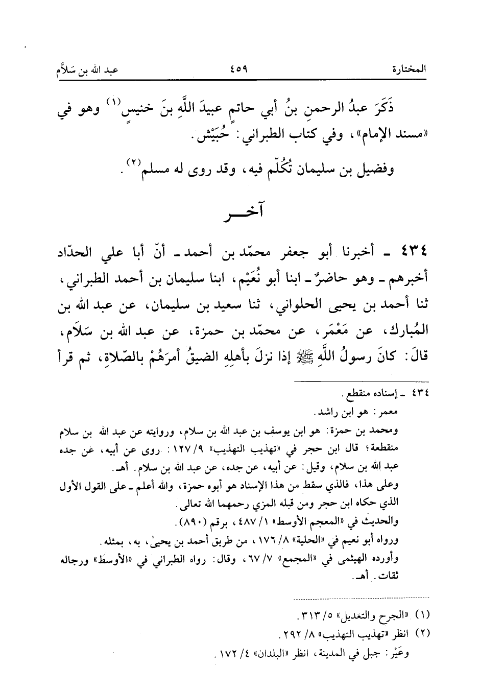 ٤٣٤ - أَخْبَرَنَا أَبُو جَعْفَرٍ مُحَمَّدُ بْنُ أَحْمَدَ، أَنَّ أَبَا عَلِيٍّ الْحَدَّادَ أَخْبَرَهُمْ - وَهُوَ حَاضِرٌ - أَبْنَا أَبُو نُعَيْمٍ، أَبْنَا سُلَيْمَانُ بْنُ أَحْمَدَ الطَّبَرَانِيُّ، ثَنَا أَحْمَدُ بْنُ يَحْيَى الْحُلْوَانِيُّ، ثَنَا سَعِيدُ بْنُ سُلَيْمَانَ، عَنْ عَبْدِ اللهِ بْنِ الْمُبَارَكِ، عَنْ مَعْمَرٍ، عَنْ مُحَمَّدِ بْنِ حَمْزَةَ، عَنْ عَبْدِ اللهِ بْنِ سَلَامٍ قَالَ: «كَانَ رَسُولُ اللهِ صَلَّى اللهُ عَلَيْهِ وَسَلَّمَ إِذَا نَزَلَ بِأَهْلِهِ الضِّيقُ أَمَرَهُمْ بِالصَّلَاةِ، ثُمَّ قَرَأَ