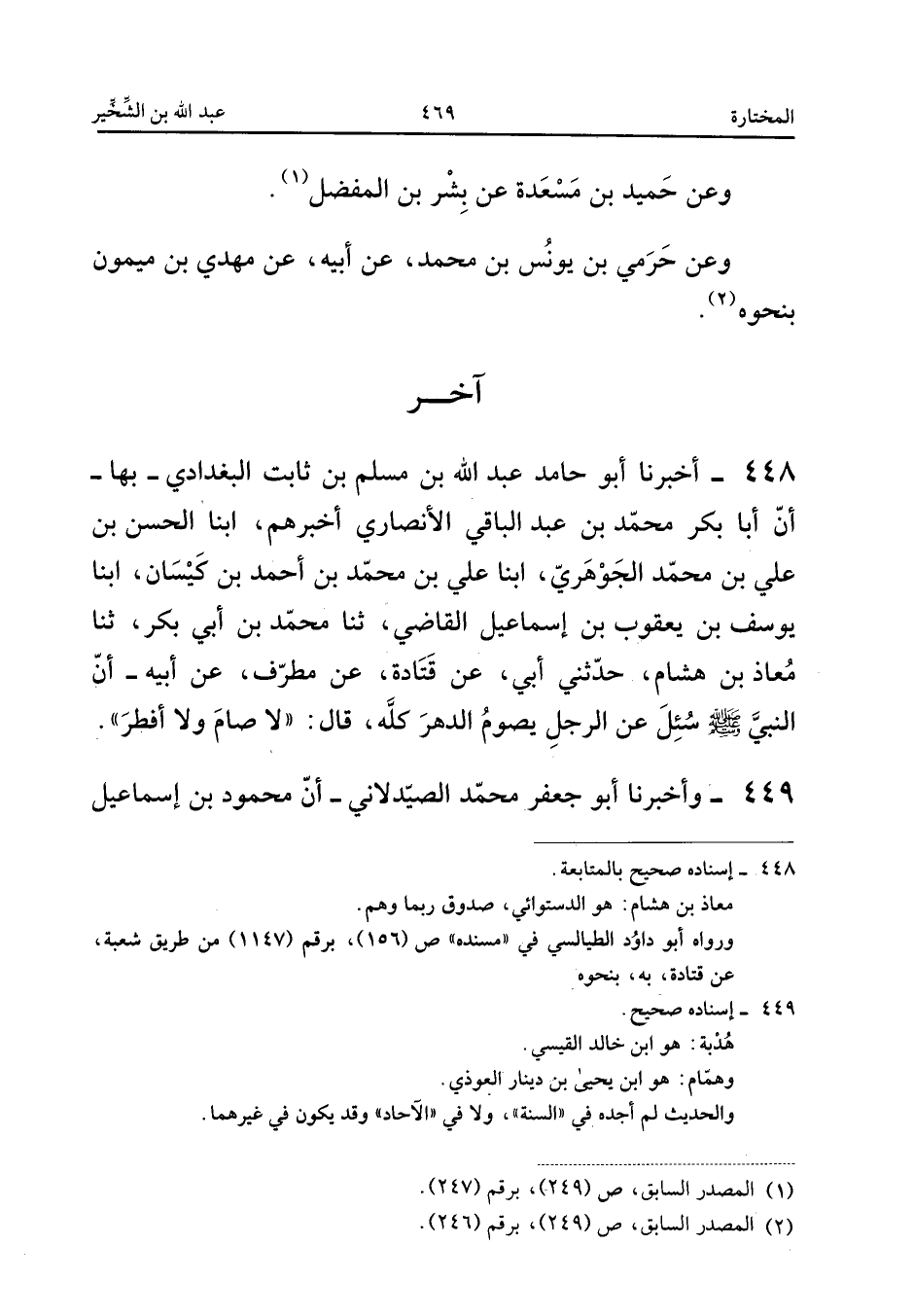 ٤٤٨ - أَخْبَرَنَا أَبُو حَامِدٍ عَبْدُ اللهِ بْنُ مُسْلِمِ بْنِ ثَابِتٍ الْبَغْدَادِيُّ - بِهَا - أَنَّ أَبَا بَكْرٍ مُحَمَّدُ بْنُ عَبْدِ الْبَاقِي الْأَنْصَارِيُّ أَخْبَرَهُمْ، أَبْنَا الْحَسَنُ بْنُ عَلِيِّ بْنِ مُحَمَّدٍ الْجَوْهَرِيُّ، أَبْنَا عَلِيُّ بْنُ مُحَمَّدِ بْنِ أَحْمَدَ بْنِ كَيْسَانَ، أَبْنَا يُوسُفُ بْنُ يَعْقُوبَ بْنِ إِسْمَاعِيلَ الْقَاضِي، ثَنَا مُحَمَّدُ بْنُ أَبِي بَكْرٍ، ثَنَا مُعَاذُ بْنُ هِشَامٍ، حَدَّثَنِي أَبِي، عَنْ قَتَادَةَ، عَنْ مُطَرِّفٍ، عَنْ أَبِيهِ: أَنَّ النَّبِيَّ صَلَّى اللهُ عَلَيْهِ وَسَلَّمَ «سُئِلَ عَنِ الرَّجُلِ يَصُومُ الدَّهْرَ كُلَّهُ، قَالَ: لَا صَامَ وَلَا أَفْطَرَ».