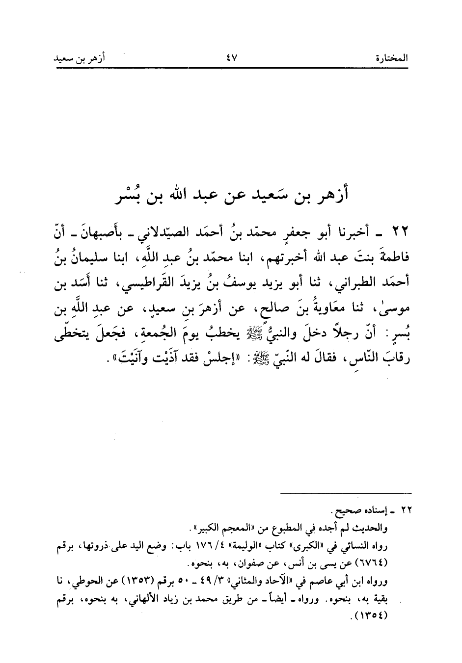 ٢٢ - أَخْبَرَنَا أَبُو جَعْفَرٍ مُحَمَّدُ بْنُ أَحْمَدَ الصَّيْدَلَانِيُّ بِأَصْبَهَانَ، أَنَّ فَاطِمَةَ بِنْتَ عَبْدِ اللهِ أَخْبَرَتْهُمْ، أَبْنَا مُحَمَّدُ بْنُ عَبْدِ اللهِ، أَبْنَا سُلَيْمَانُ بْنُ أَحْمَدَ الطَّبَرَانِيُّ، ثَنَا أَبُو يَزِيدَ يُوسُفُ بْنُ يَزِيدَ الْقَرَاطِيسِيُّ، ثَنَا أَسَدُ بْنُ مُوسَى، ثَنَا مُعَاوِيَةُ بْنُ صَالِحٍ، عَنْ أَزْهَرَ بْنِ سَعِيدٍ، عَنْ عَبْدِ اللهِ بْنِ بُسْرٍ: «أَنَّ رَجُلًا دَخَلَ وَالنَّبِيُّ صَلَّى اللهُ عَلَيْهِ وَسَلَّمَ يَخْطُبُ يَوْمَ الْجُمُعَةِ، فَجَعَلَ يَتَخَطَّى رِقَابَ النَّاسِ، فَقَالَ لَهُ النَّبِيُّ صَلَّى اللهُ عَلَيْهِ وَسَلَّمَ: اجْلِسْ فَقَدْ آذَيْتَ وَآنَيْتَ».