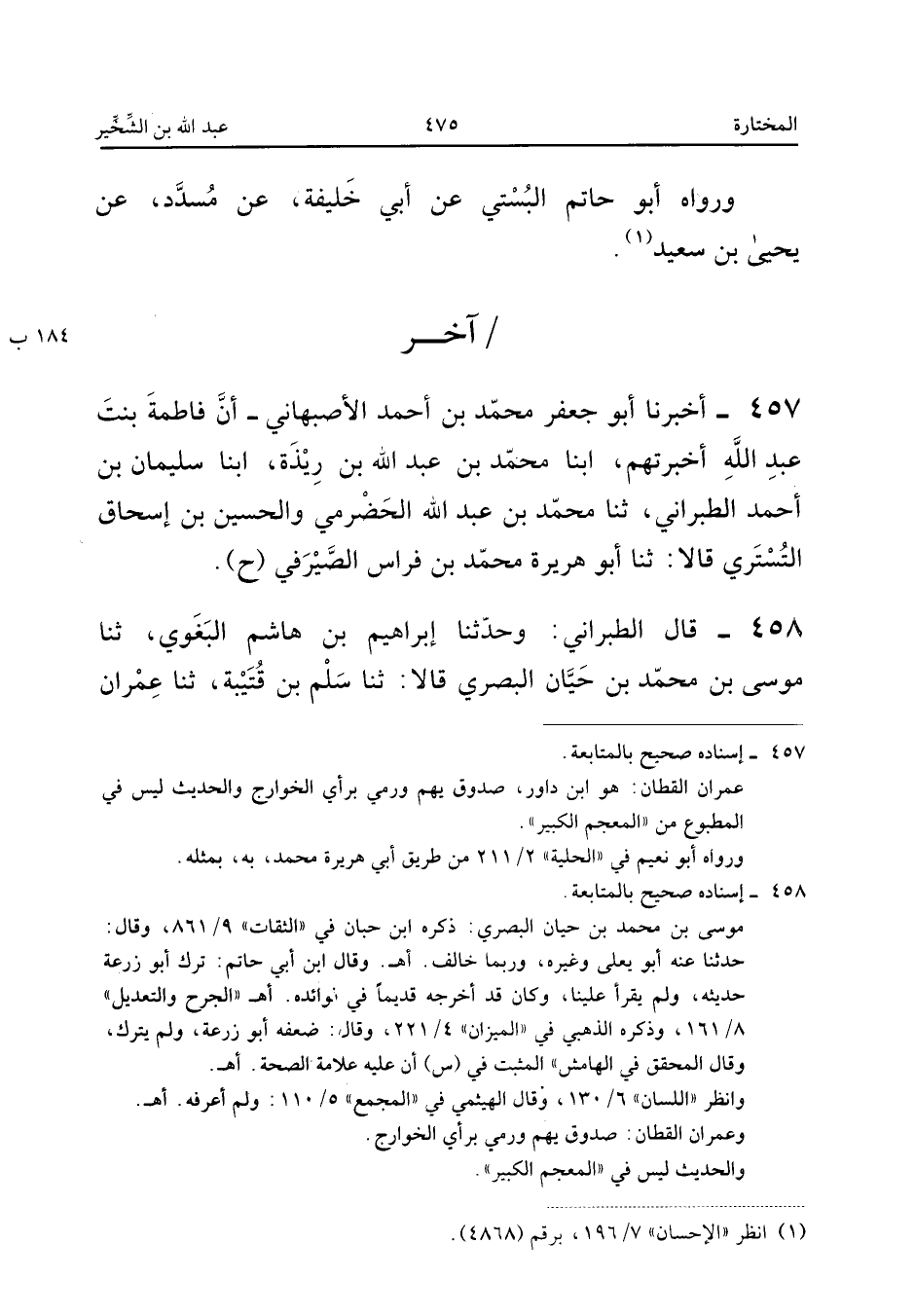٤٥٨ - قَالَ الطَّبَرَانِيُّ: وَحَدَّثَنَا إِبْرَاهِيمُ بْنُ هَاشِمٍ الْبَغَوِيُّ، ثَنَا مُوسَى بْنُ مُحَمَّدِ بْنِ حَيَّانَ الْبَصْرِيُّ قَالَا: ثَنَا سَلْمُ بْنُ قُتَيْبَةَ، ثَنَا عِمْرَانُ