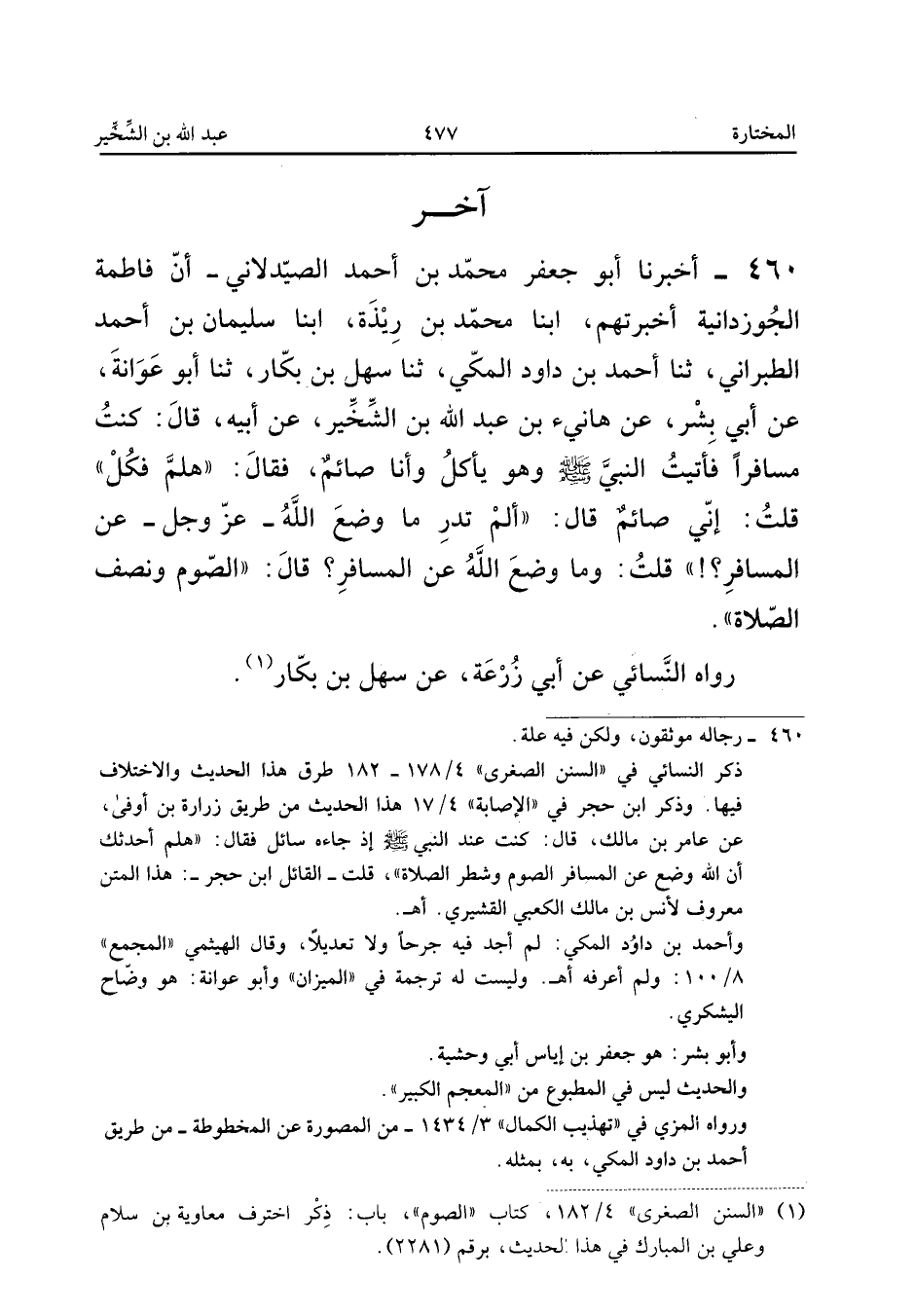 ٤٦٠ - أَخْبَرَنَا أَبُو جَعْفَرٍ مُحَمَّدُ بْنُ أَحْمَدَ الصَّيْدَلَانِيُّ، أَنَّ فَاطِمَةَ الْجُوزْدَانِيَّةَ أَخْبَرَتْهُمْ، أَبْنَا مُحَمَّدُ بْنُ رِيذَةَ، أَبْنَا سُلَيْمَانُ بْنُ أَحْمَدَ الطَّبَرَانِيُّ، ثَنَا أَحْمَدُ بْنُ دَاوُدَ الْمَكِّيُّ، ثَنَا سَهْلُ بْنُ بَكَّارٍ، ثَنَا أَبُو عَوَانَةَ، عَنْ أَبِي بِشْرٍ، عَنْ هَانِئِ بْنِ عَبْدِ اللهِ بْنِ الشِّخِّيرِ، عَنْ أَبِيهِ قَالَ: «كُنْتُ مُسَافِرًا فَأَتَيْتُ النَّبِيَّ صَلَّى اللهُ عَلَيْهِ وَسَلَّمَ وَهُوَ يَأْكُلُ وَأَنَا صَائِمٌ، فَقَالَ: هَلُمَّ فَكُلْ، قُلْتُ: إِنِّي صَائِمٌ، قَالَ: أَلَمْ تَدْرِ مَا وَضَعَ اللهُ عَزَّ وَجَلَّ عَنِ الْمُسَافِرِ؟ قُلْتُ: وَمَا وَضَعَ اللهُ عَنِ الْمُسَافِرِ؟ قَالَ: الصَّوْمَ وَنِصْفَ الصَّلَاةِ».