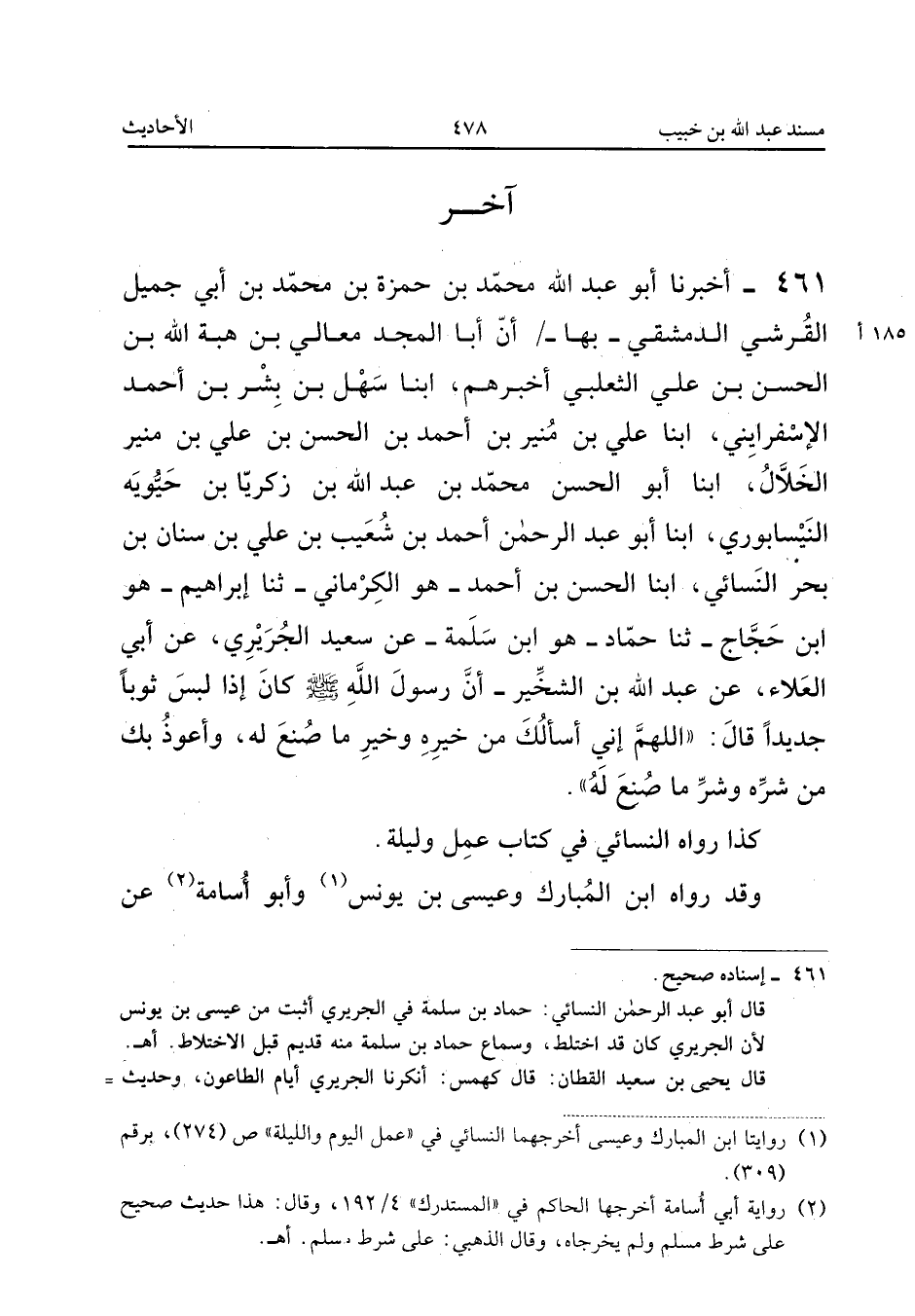 ٤٦١ - أَخْبَرَنَا أَبُو عَبْدِ اللهِ مُحَمَّدُ بْنُ حَمْزَةَ بْنِ مُحَمَّدِ بْنِ أَبِي جَمِيلٍ الْقُرَشِيُّ الدِّمَشْقِيُّ - بِهَا - أَنَّ أَبَا الْمَجْدِ مَعَالِي بْنَ هِبَةِ اللهِ بْنِ الْحَسَنِ بْنِ عَلِيٍّ الثَّعْلَبِيَّ أَخْبَرَهُمْ، أَبْنَا سَهْلُ بْنُ بِشْرِ بْنِ أَحْمَدَ الْإِسْفَرَايِينِيُّ، أَبْنَا عَلِيُّ بْنُ مُنِيرِ بْنِ أَحْمَدَ بْنِ الْحَسَنِ بْنِ عَلِيِّ بْنِ مُنِيرٍ الْخَلَّالُ، أَبْنَا أَبُو الْحَسَنِ مُحَمَّدُ بْنُ عَبْدِ اللهِ بْنِ زَكَرِيَّا بْنِ حَيُّوَيْهِ النَّيْسَابُورِيُّ، أَبْنَا أَبُو عَبْدِ الرَّحْمَنِ أَحْمَدُ بْنُ شُعَيْبِ بْنِ عَلِيِّ بْنِ سِنَانِ بْنِ بَحْرٍ النَّسَائِيُّ، أَبْنَا الْحَسَنُ بْنُ أَحْمَدَ - هُوَ الْكَرْمَانِيُّ - ثَنَا إِبْرَاهِيمُ - هُوَ ابْنُ حَجَّاجٍ - ثَنَا حَمَّادٌ - هُوَ ابْنُ سَلَمَةَ - عَنْ سَعِيدٍ الْجُرَيْرِيِّ، عَنْ أَبِي الْعَلَاءِ، عَنْ عَبْدِ اللهِ بْنِ الشِّخِّيرِ: أَنَّ رَسُولَ اللهِ صَلَّى اللهُ عَلَيْهِ وَسَلَّمَ «كَانَ إِذَا لَبِسَ ثَوْبًا جَدِيدًا قَالَ: اللَّهُمَّ إِنِّي أَسْأَلُكَ مِنْ خَيْرِهِ وَخَيْرِ مَا صُنِعَ لَهُ، وَأَعُوذُ بِكَ مِنْ شَرِّهِ وَشَرِّ مَا صُنِعَ لَهُ».