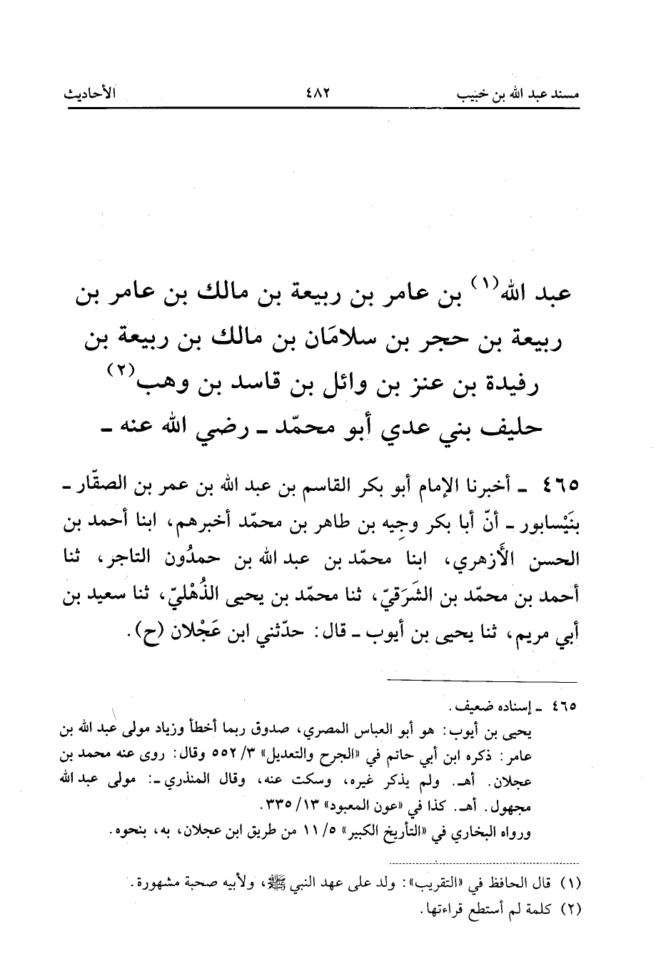 ٤٦٥ - أَخْبَرَنَا الْإِمَامُ أَبُو بَكْرٍ الْقَاسِمُ بْنُ عَبْدِ اللهِ بْنِ عُمَرَ بْنِ الصَّقَّارِ - بِنَيْسَابُورَ - أَنَّ أَبَا بَكْرٍ وَجِيهَ بْنَ طَاهِرِ بْنِ مُحَمَّدٍ أَخْبَرَهُمْ، أَبْنَا أَحْمَدُ بْنُ الْحَسَنِ الْأَزْهَرِيُّ، أَبْنَا مُحَمَّدُ بْنُ عَبْدِ اللهِ بْنِ حَمْدُونٍ التَّاجِرُ، ثَنَا أَحْمَدُ بْنُ مُحَمَّدِ بْنِ الشَّرْقِيِّ، ثَنَا مُحَمَّدُ بْنُ يَحْيَى الذُّهْلِيُّ، ثَنَا سَعِيدُ بْنُ أَبِي مَرْيَمَ، ثَنَا يَحْيَى بْنُ أَيُّوبَ قَالَ: حَدَّثَنِي ابْنُ عَجْلَانَ (ح).