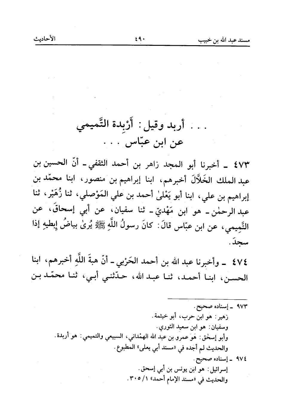 ٤٧٣ - أَخْبَرَنَا أَبُو الْمَجْدِ زَاهِرُ بْنُ أَحْمَدَ الثَّقَفِيُّ أَنَّ الْحُسَيْنَ بْنَ عَبْدِ الْمَلِكِ الْخَلَّالَ أَخْبَرَهُمْ، أَبْنَا إِبْرَاهِيمُ بْنُ مَنْصُورٍ، أَبْنَا مُحَمَّدُ بْنُ إِبْرَاهِيمَ بْنِ عَلِيٍّ، أَبْنَا أَبُو يَعْلَى أَحْمَدُ بْنُ عَلِيٍّ الْمَوْصِلِيُّ، ثَنَا زُهَيْرٌ، ثَنَا عَبْدُ الرَّحْمَنِ - هُوَ ابْنُ مَهْدِيٍّ - ثَنَا سُفْيَانُ، عَنْ أَبِي إِسْحَاقَ، عَنِ التَّمِيمِيِّ، عَنِ ابْنِ عَبَّاسٍ قَالَ: «كَانَ رَسُولُ اللهِ صَلَّى اللهُ عَلَيْهِ وَسَلَّمَ يُرَى بَيَاضُ إِبْطَيْهِ إِذَا سَجَدَ».